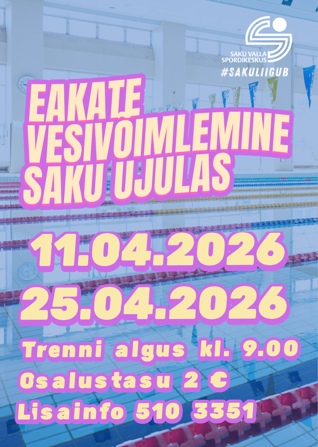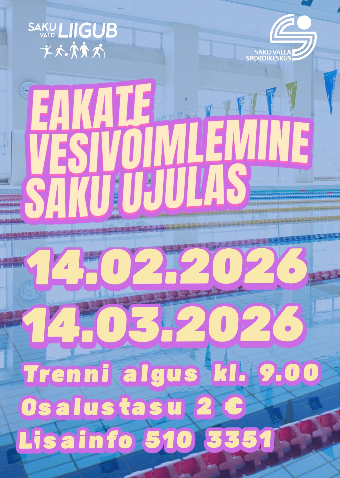 2 €Saku Spordikeskus kutsub kõiki aktiivseid eakaid vesivõimlemise trenni, mida viib läbi Annely-Thea Häggblom. Trennide algus on kl. 9.00 ja tasu 2 €.