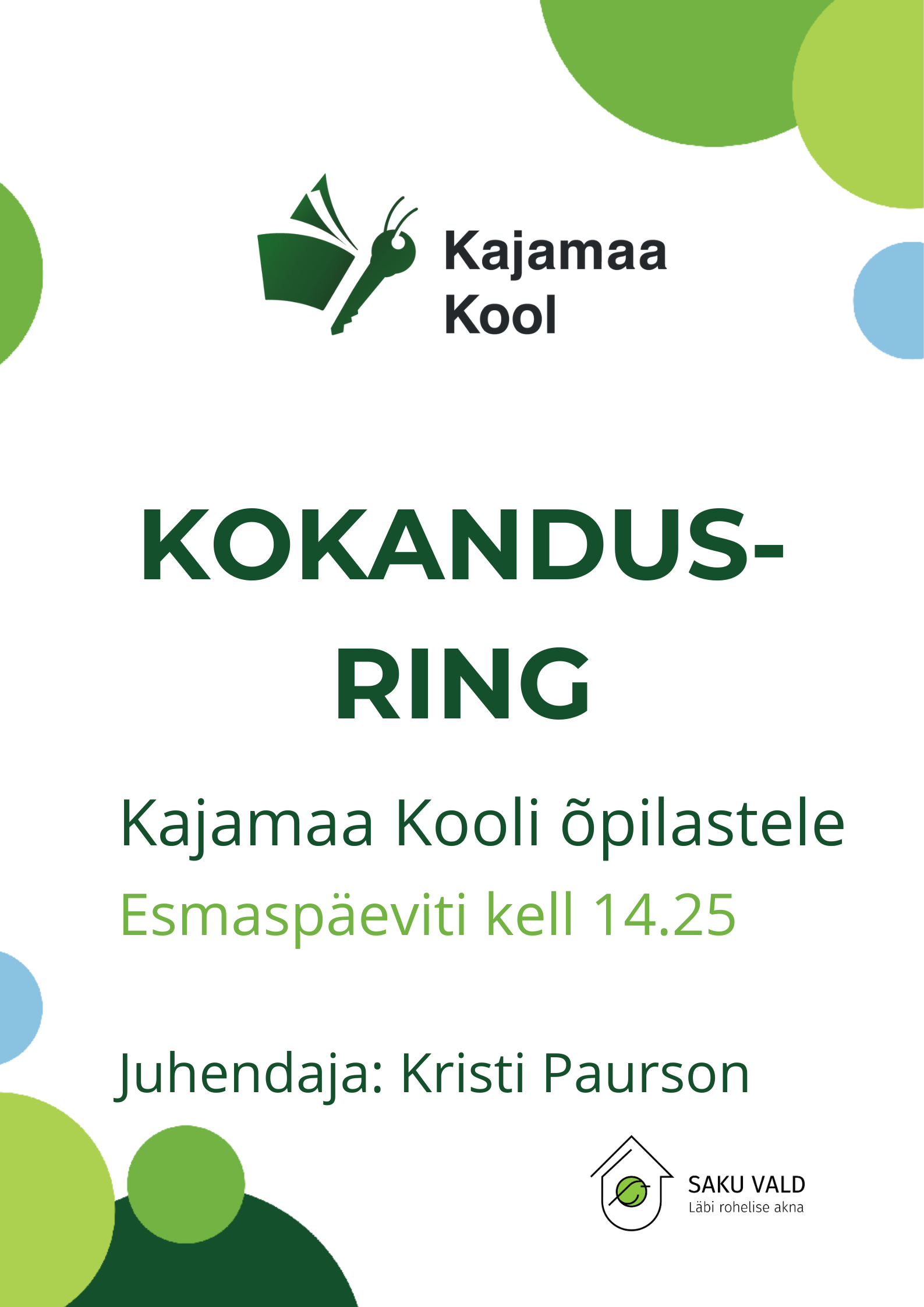 Kajamaa Kooli 4., 4.A, 5.A, 5. ja 6. klassi õpilastele toimub 2025/26. õppeaasta I poolaastal esmaspäeviti kell 14.35–15.20 (7. tund) söögisaalis kokandusring. Juhendaja on Aigi Kasemaa.