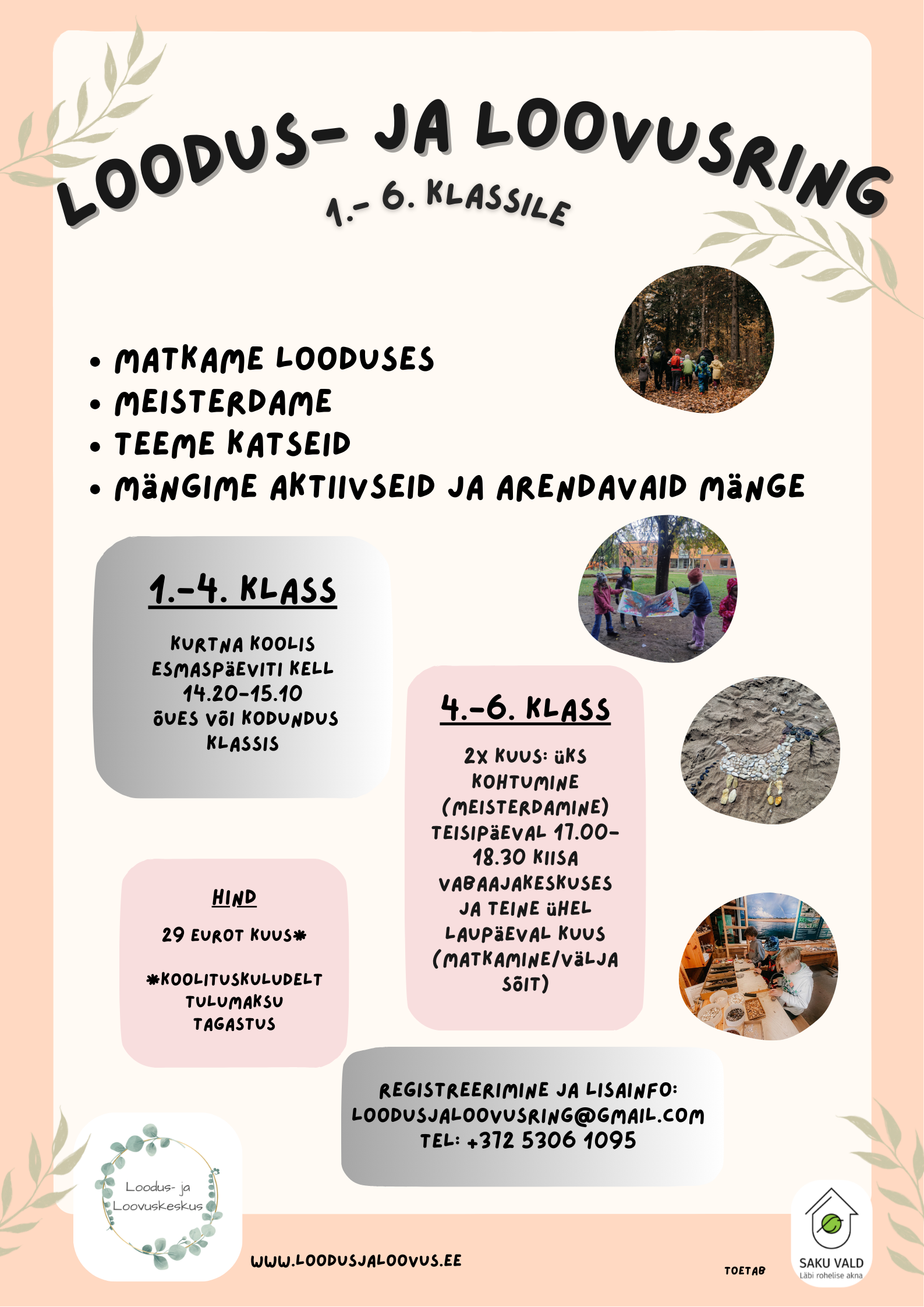 29 eurot (koolituskuludelt saab tagasi tulumaksu)Loodus- ja Loovusringis toetame laste arengut nii õues kui ka tubases keskkonnas. Tegeleme matkade, meisterdamise, looduse tundmaõppimise, katsete, taaskasutuse tutvustamise ning aktiivsete ja arendavate mängudega.