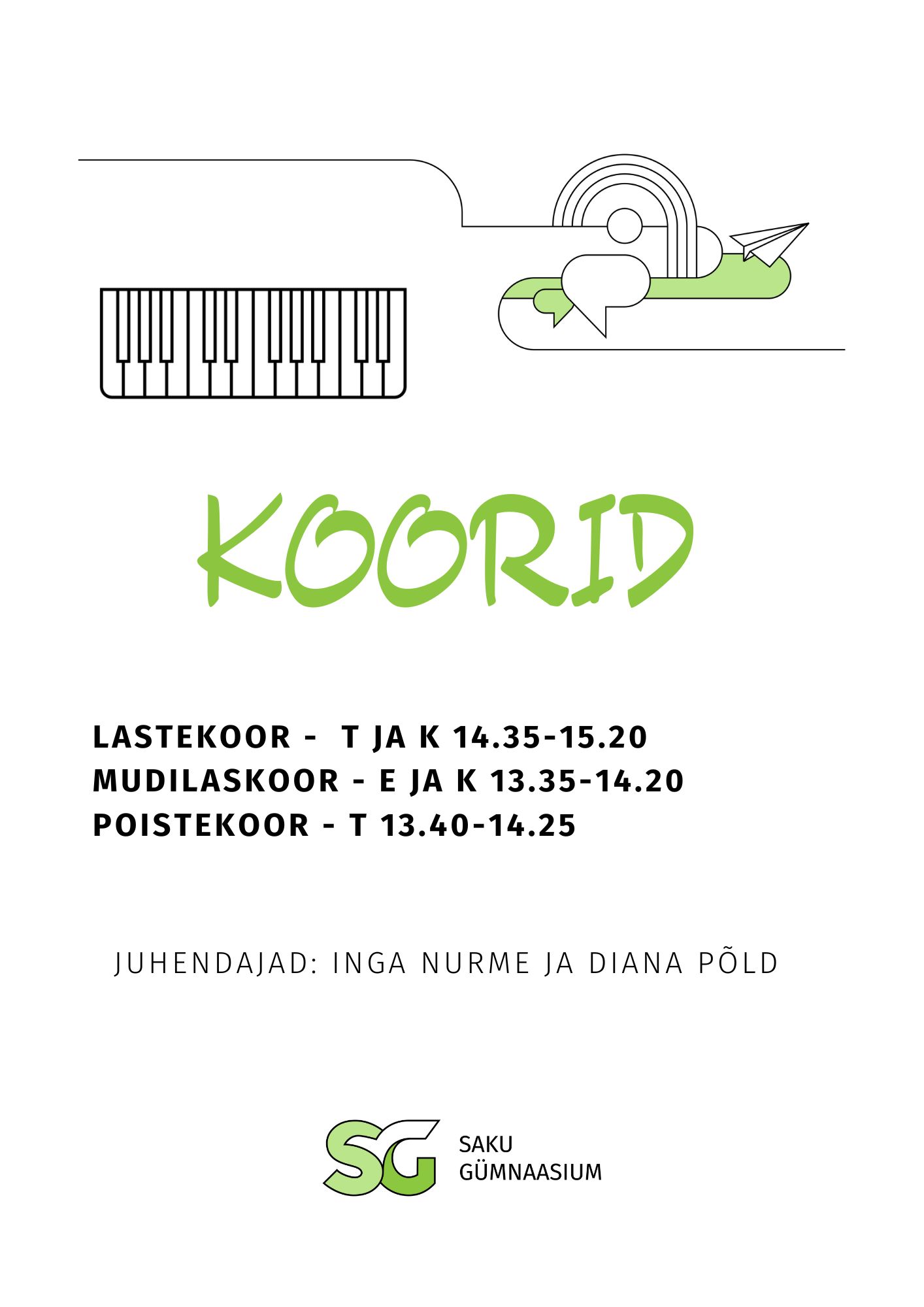 Lastekoor - T ja K 14.35-15.20 Mudilaskoor - E ja K 13.35-14.20 Poistekoor - T 13.40-14.25Vanusegrupp: