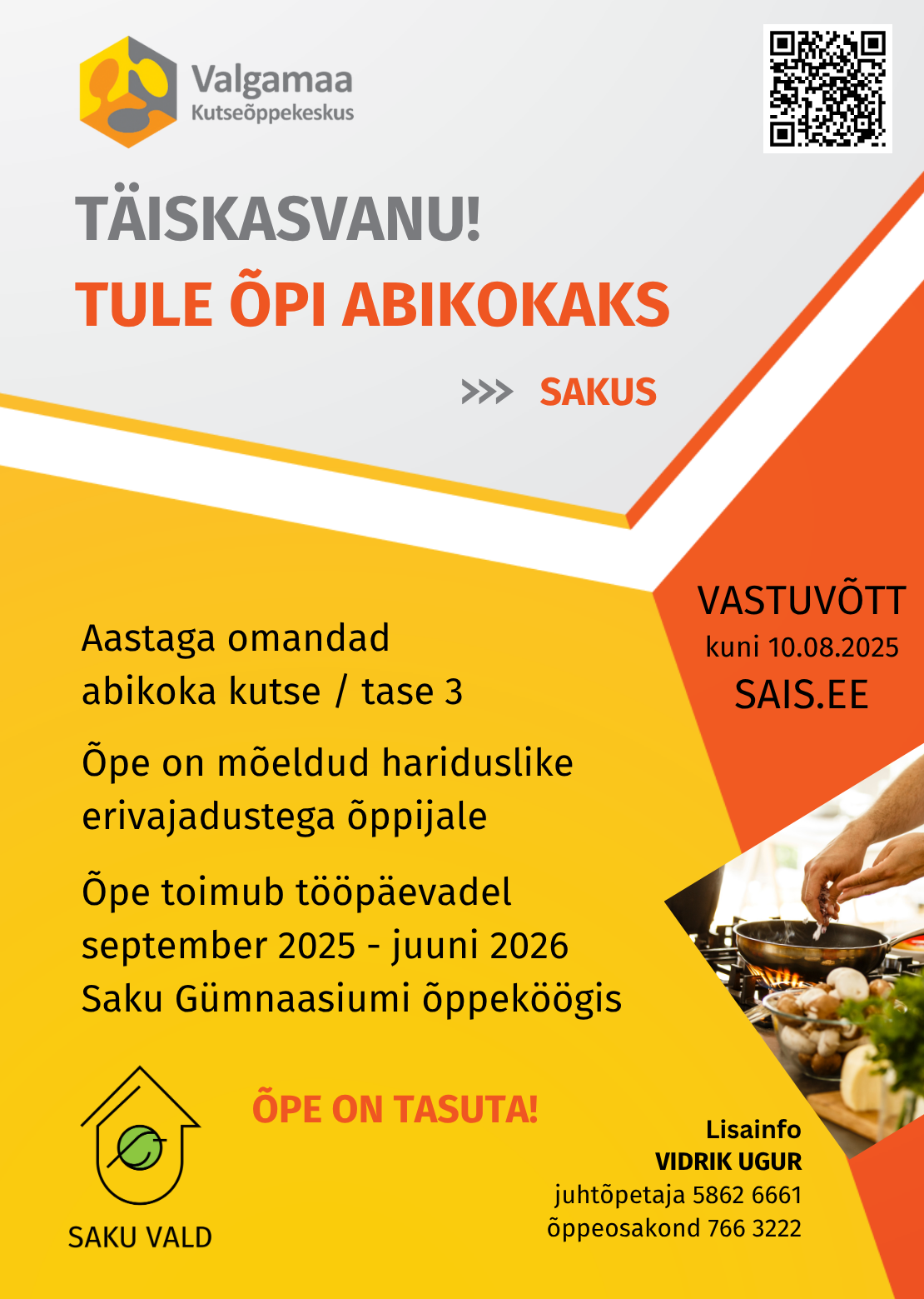 Õpe on tasuta. Kandideerimine toimub SAISis.Otsime õpihimulisi abikokaks õppijaid!