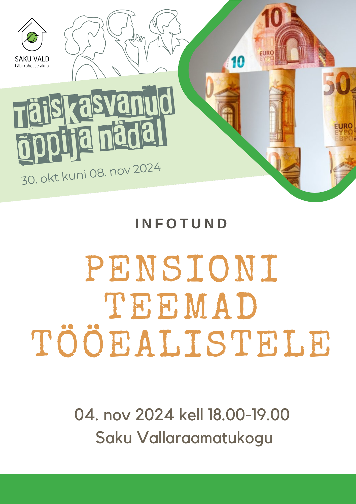 Tasuta. Vajalik etteregistreerimine.Täiskasvanud õppija nädala raames arutleme Eesti pensionisüsteemi üle ning mõtiskleme selle üle kuidas oma tulevikku planeerida. Juttu tuleb sellest milliseid otsuseid täna langetada, et tagada endale võimalikult muretu pensionipõlv. Infotunni käigus anname ülevaate Eesti pensionisüsteemist kõigi kolme pensionisamba vaates. Räägime lahti ka peamised pensionit puudutavad muudatused. Jagame praktilisi näpunäiteid, kust ja kuidas leida oma isiklikud pensioniandmed ning kuidas kujuneb pensioni suurus. Kuulajad on oodatud aktiivselt kaasa mõtlema ja küsimusi esitama.