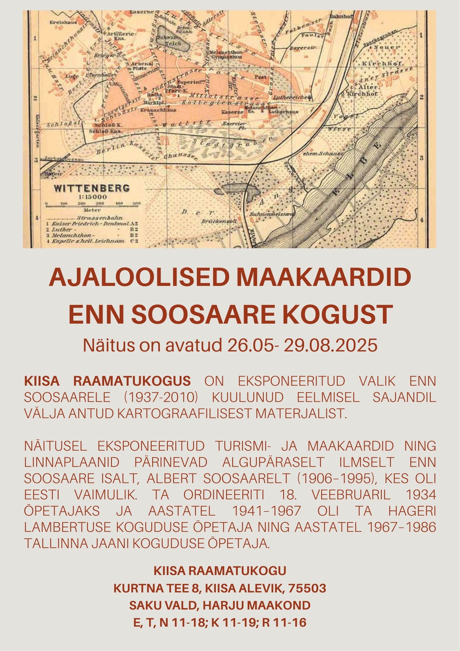 Näitusel on eksponeeritud turismi- ja maakaardid ning linnaplaanid pärinevad algupäraselt ilmselt Enn Soosaare isalt, Albert Soosaarelt (1906-1995), kes oli eesti vaimulik. Ta ordineeriti 18. veebruaril 1934 õpetajaks ja aastatel 1941-1967 oli ta Hageri Lambertuse koguduse õpetaja ning aastatel 1967-1986 Tallinna Jaani koguduse õpetaja.