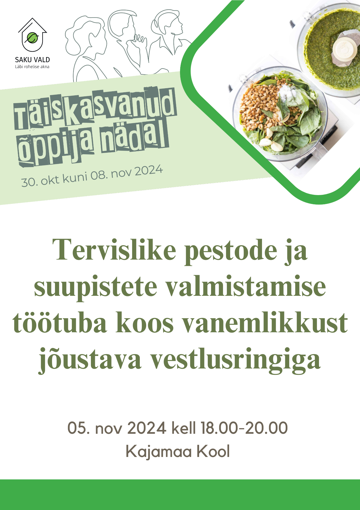 Kajamaa Kool ootab Sind hubasesse hilissügisesse töötuppa. Valmistame tervislikke pestosid ja suupisteid.  Toimub laste vaimse tervise raskusi ennetav ning vanemlikkust jõustav juhtumianalüüs ja vestlusring.