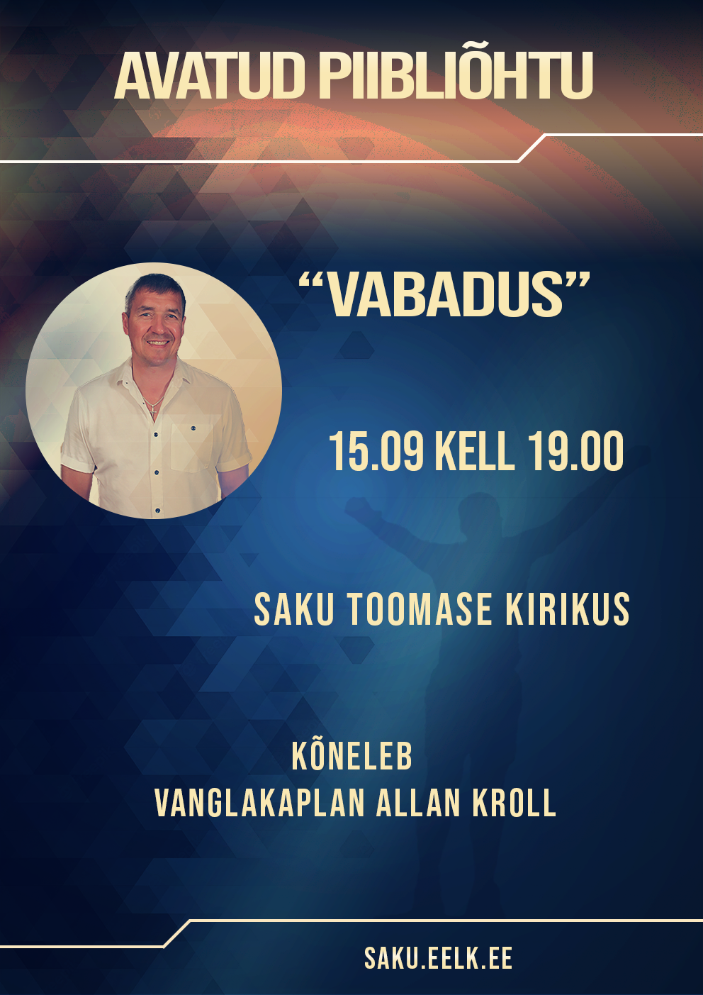 Oled oodatud avatud piibliõhtule teemal “Vabadus” 15.09 kell 19.00 Saku Toomase kirikusse. Kõneleb vanglakaplan Allan Kroll, kaasa teenib koguduse ülistusbänd.