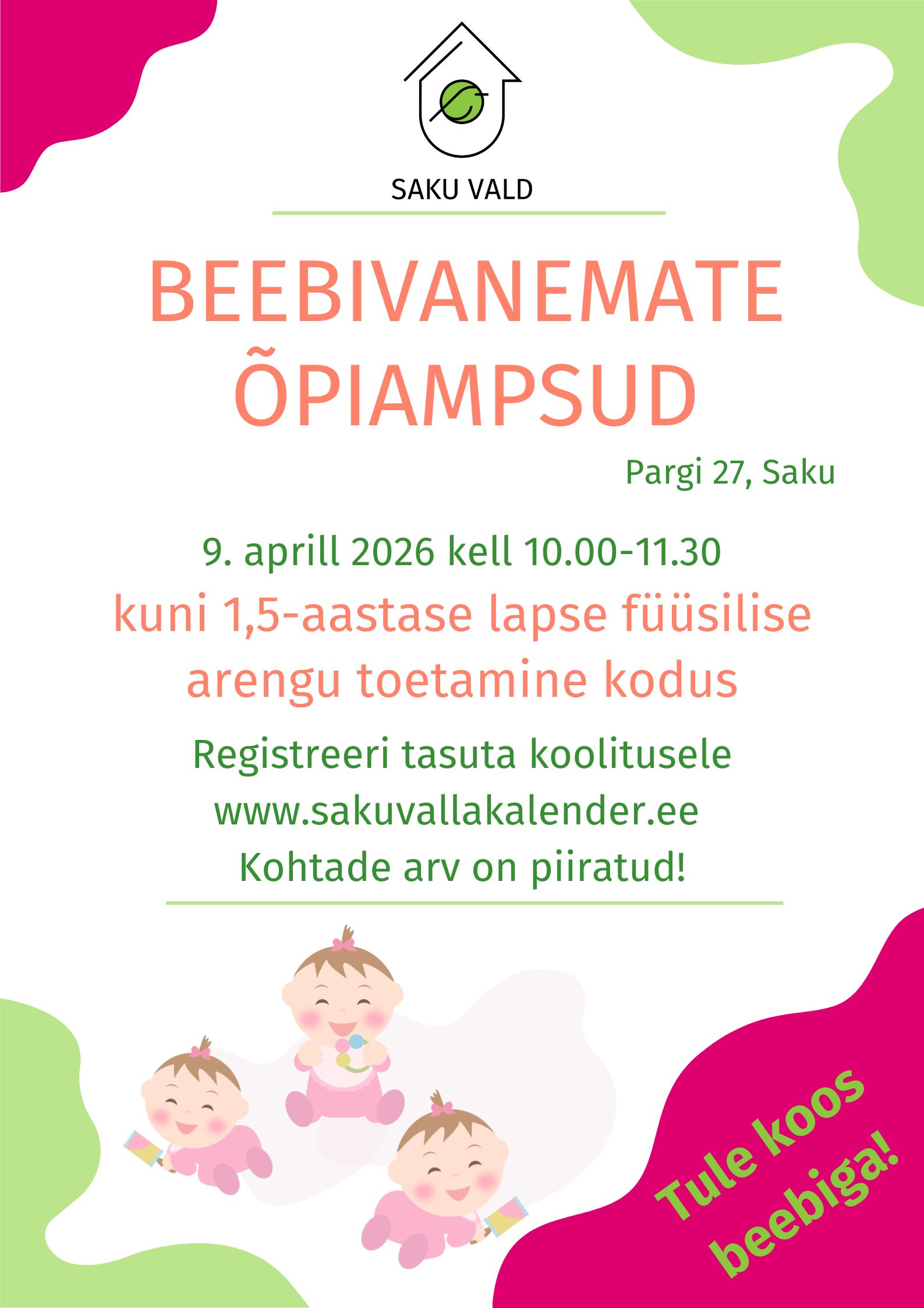 Saku vald kutsub kuni 1,5-aastaste laste vanemaid 9. aprillil 2026 kell 10-11.30 toimuvale õpiampsule, kus Samm-sammult füsioterapeut OÜ tuleb rääkima kuidas toetada kuni 1,5-aastase lapse füüsilise arengut kodus.