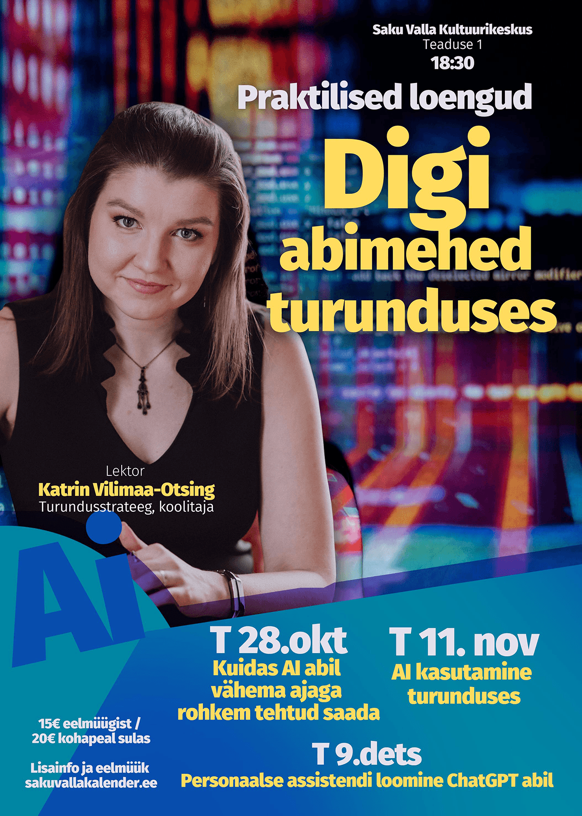 Katrin on ülikoolis õppinud informaatikat ja turunduses töötanud aastast 2010. Kuna digiturundus on muutunud aina spetsiifilisemaks ja tehnilisemaks, siis on just tehnilised teadmised selles valdkonnas kasuks tulnud. Tehisintellekti tulekuga on aina olulisem olla kursis erinevate rakenduste ja programmidega, et konkurentsis püsida. Katrin testib ja õpib igapäevaselt erinevaid AI võimalusi ja õpetab saadud teadmisi edasi.