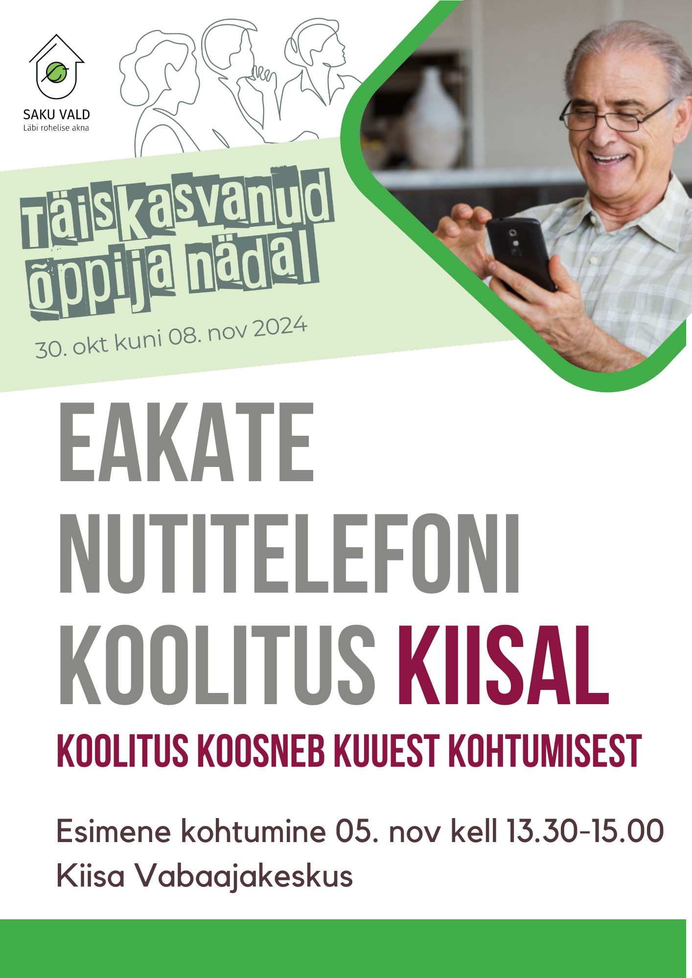 Eakate nutitelefonide kasutamise koolitus toimub kuuel järjestikkusel teisipäeval Saku Kultuurikeskuse Kiisa saalis: