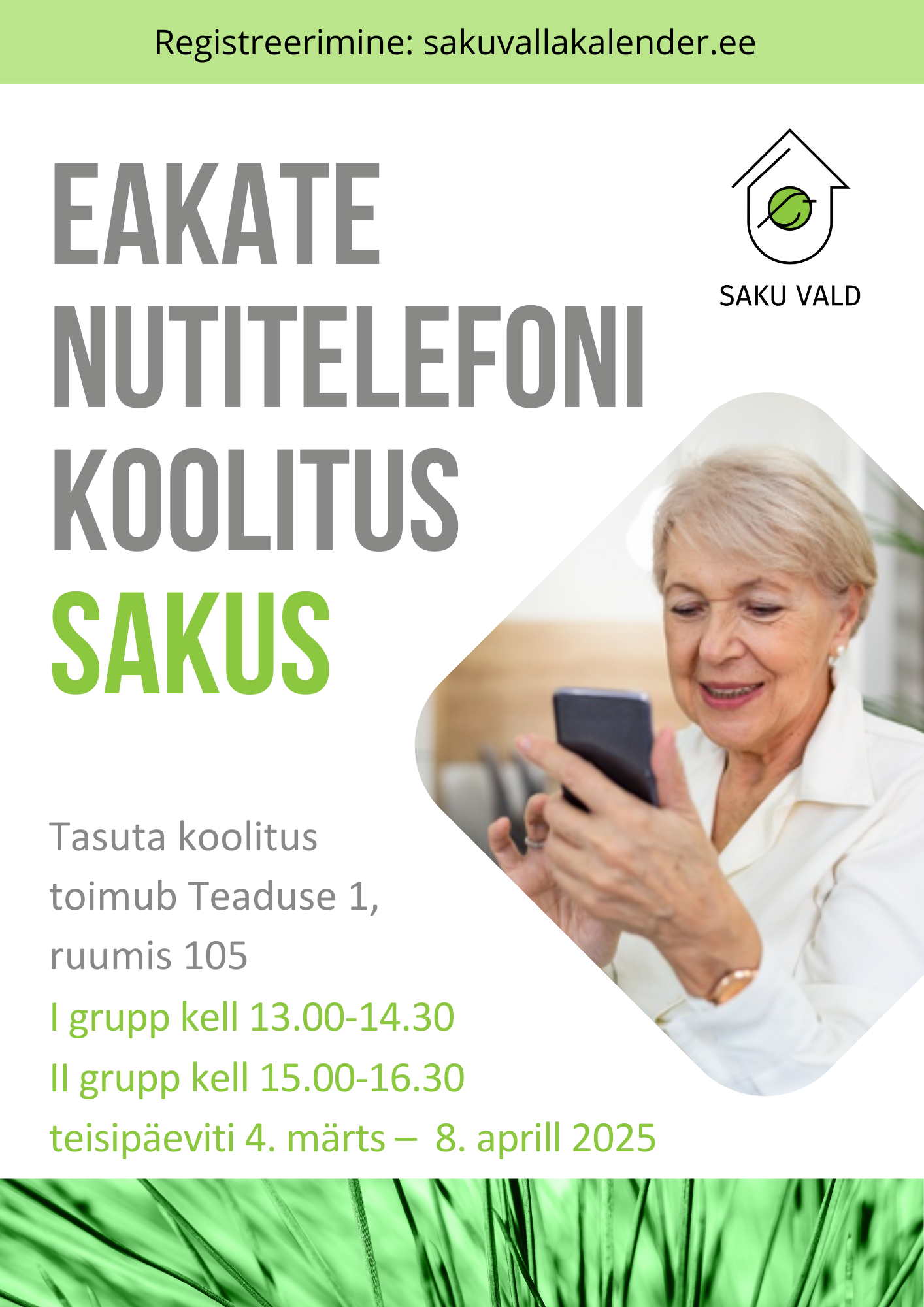 Eakate nutitelefonide kasutamise koolitus toimub kuuel järjestikkusel teisipäeval Saku Valla Kultuurikeskuse ruumis 105.