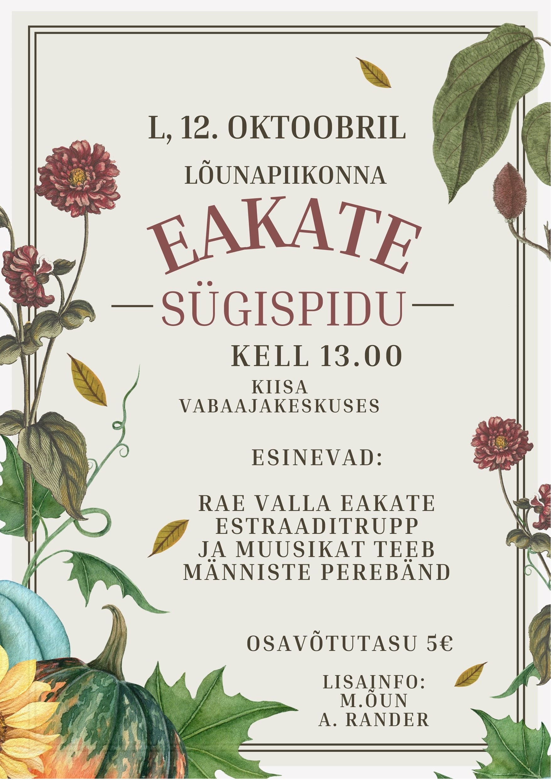 Kutsume Teid Kiisa Vabaajakeskusesse sügispeole, et koos enne talve toredasti aega veeta. Külla tulevad Rae valla eakate estraaditrupp ning muusikalist elamust pakub Männiste perebänd.