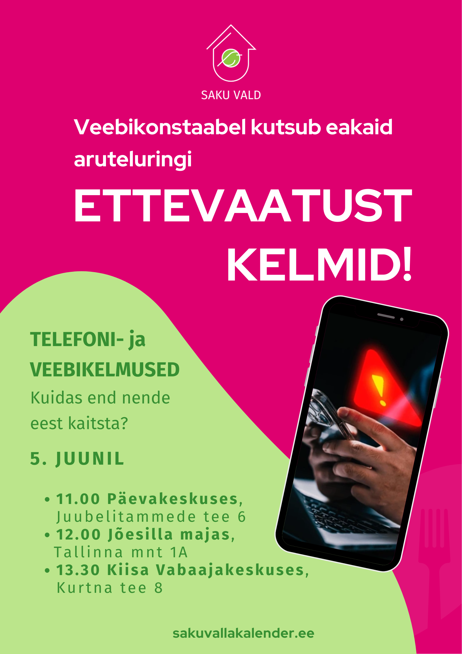 Tasuta. Ette registreerida ei ole vaja.Saku eakatele tulevad Kiisal ja Saku alevis kelmuste teemalist aruteluringi läbi viima veebikonstaablid. Räägitakse eakatele suunatud kelmustest ja antakse praktilisi nõuandeid, kuidas end nende eest kaitsta, sest kelmused on tavaliselt professionaalselt ette valmistatud ja tunduvad usutavad.