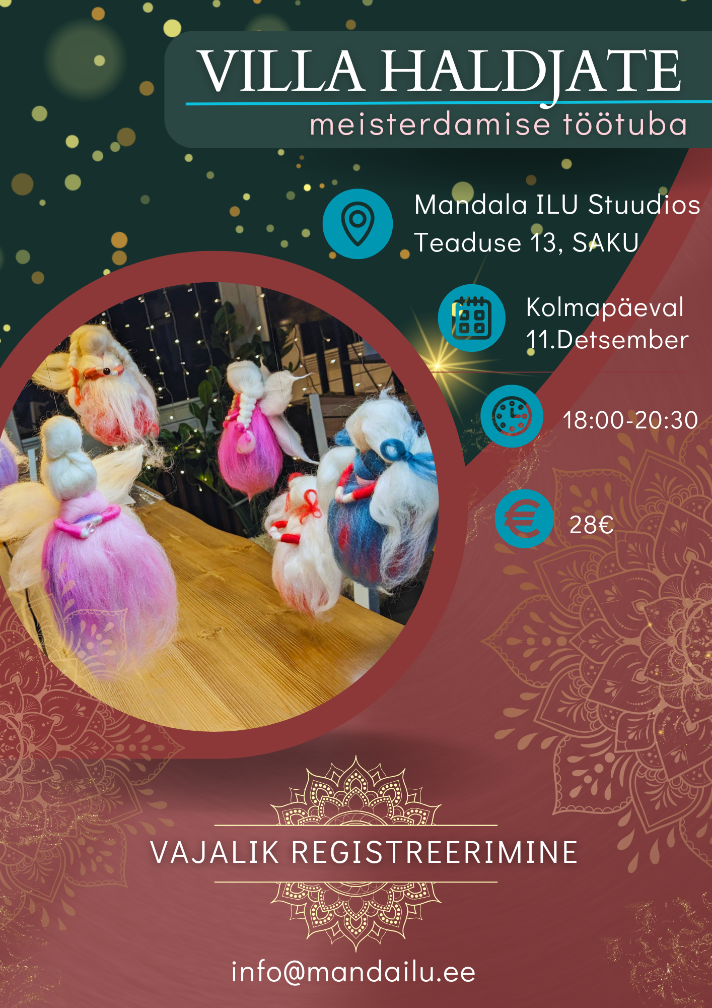 • Koha töötoas tagab 10€ ettemaks (mille tagastan, kui teatad oma mitte osalusest vähemalt 24h enne töötoa algust). Eelbroneeringut ootan: MTÜ Mandala ILU / EE272200221070530981 / tekst: Haldja töötuba 11.12.24 ja Sinu nimi. Ülejäänud summa kohapeal sulas.