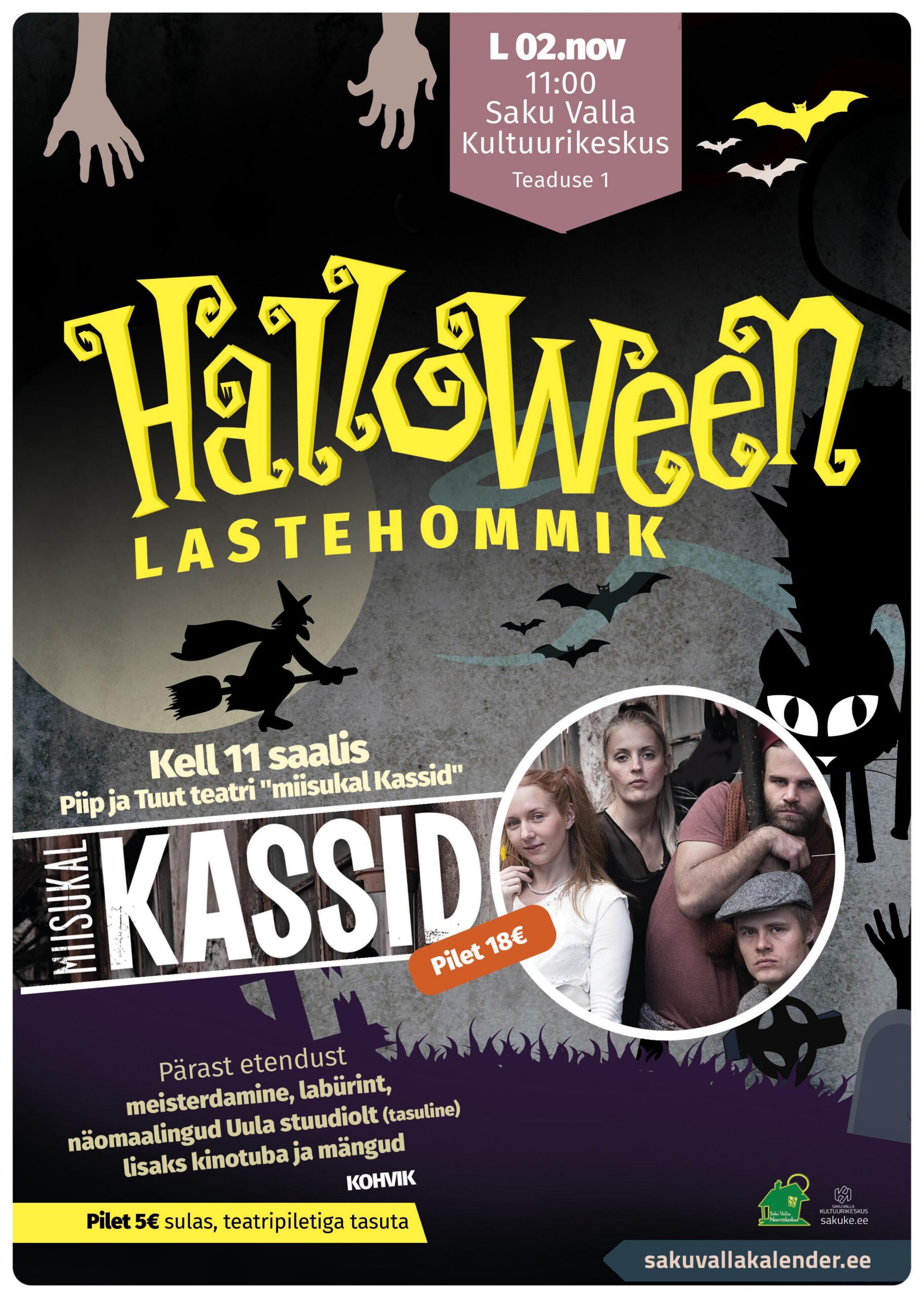 Osalustasu 5€ sulas, Teatripiletiga tasuta.12:00 Piip ja Tuut teatri “miisukal KASSID” 18€