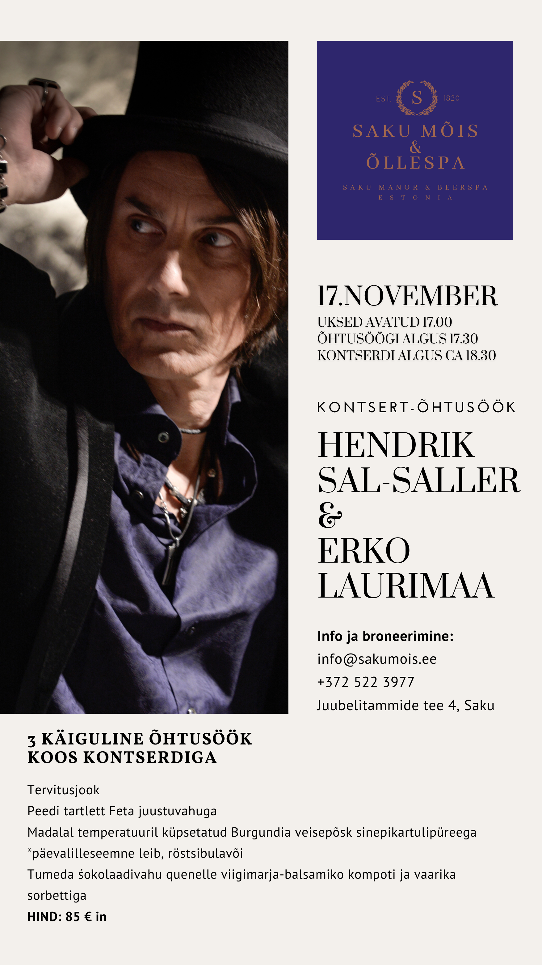 Saku mõis & Õllespa ning Hendrik Sal-Saller koos Erko Laurimaaga kutsuvad Teid 17.novembril sügisesele kontsert-õhtusöögile.