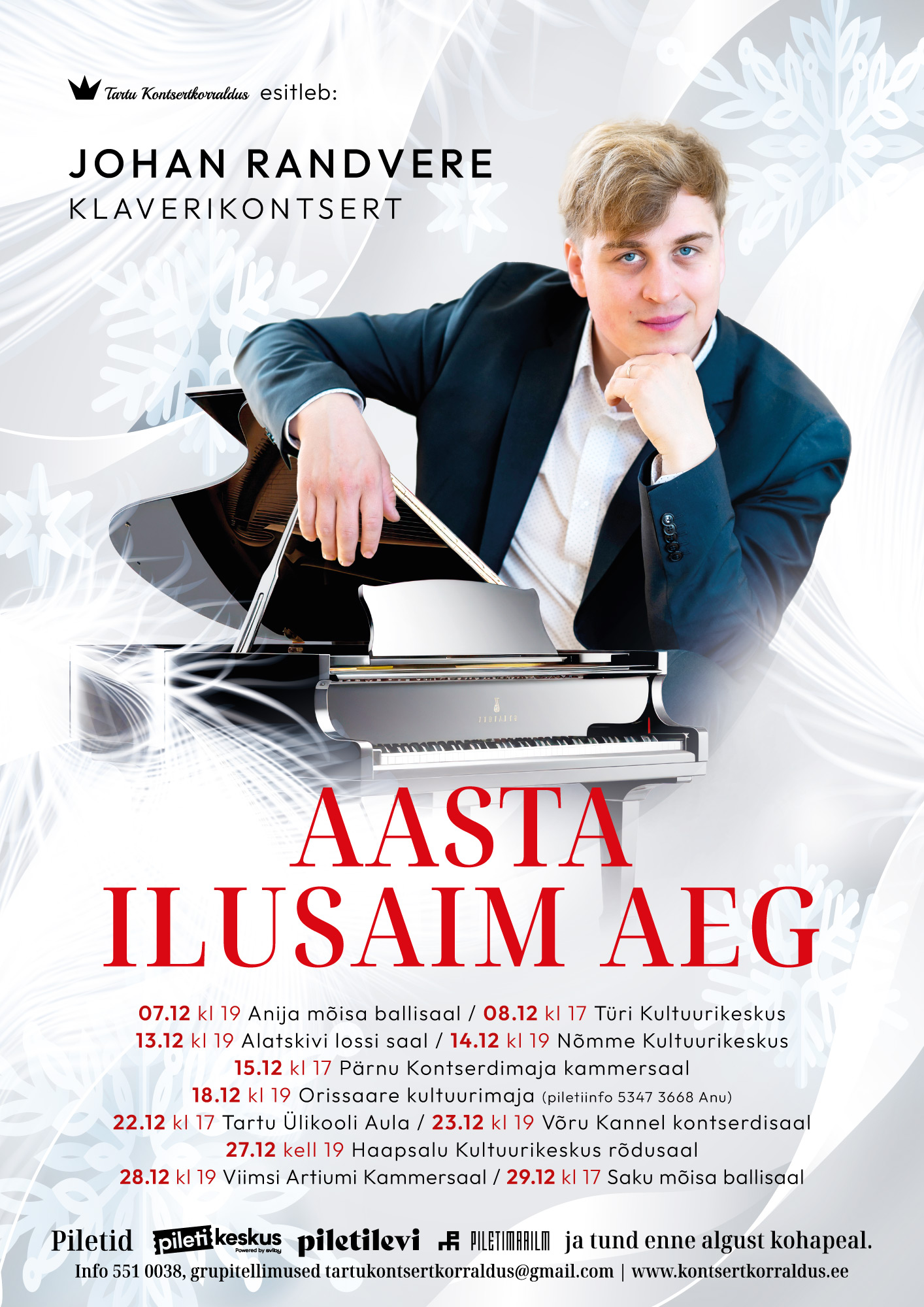 Juba kolmandat aastat kutsub Eesti tipp-pianist Johan Randvere enne kiiret aastalõppu klaverikontserdile. Tule lase lisaks meelihaaravale muusikale Johanil end viia suurte heliloojate – Sibelius, Bach, Liszt, Tšaikovski jpt elulugudesse. Pianist ütleb: “Kas olete mõelnud, mida suured heliloojad on loonud just jõuludeks? Või kui puhtalt ja kaunilt kõlavad meile armsaks saanud jõululaulud ja Lutheri koraalid klaveriga?