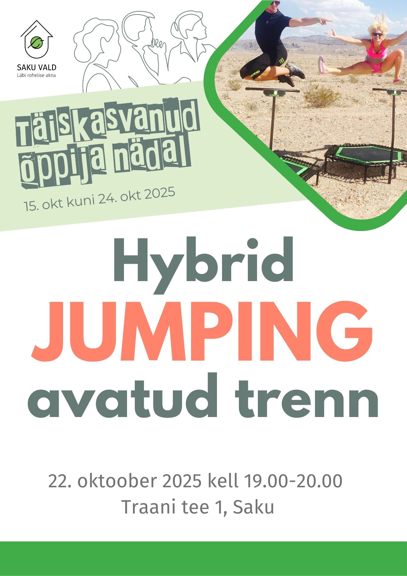 Täiskasvanud õppija nädala raames avab oma treeningu Hybrid Jumping trenn. Jumping on intensiivne ja põnev dünaamiline fitnessitreening. Jumping annab sulle korraliku koormuse, emotsionaalse laengu ja suurepärase seltskonna, kellega koos treenida.