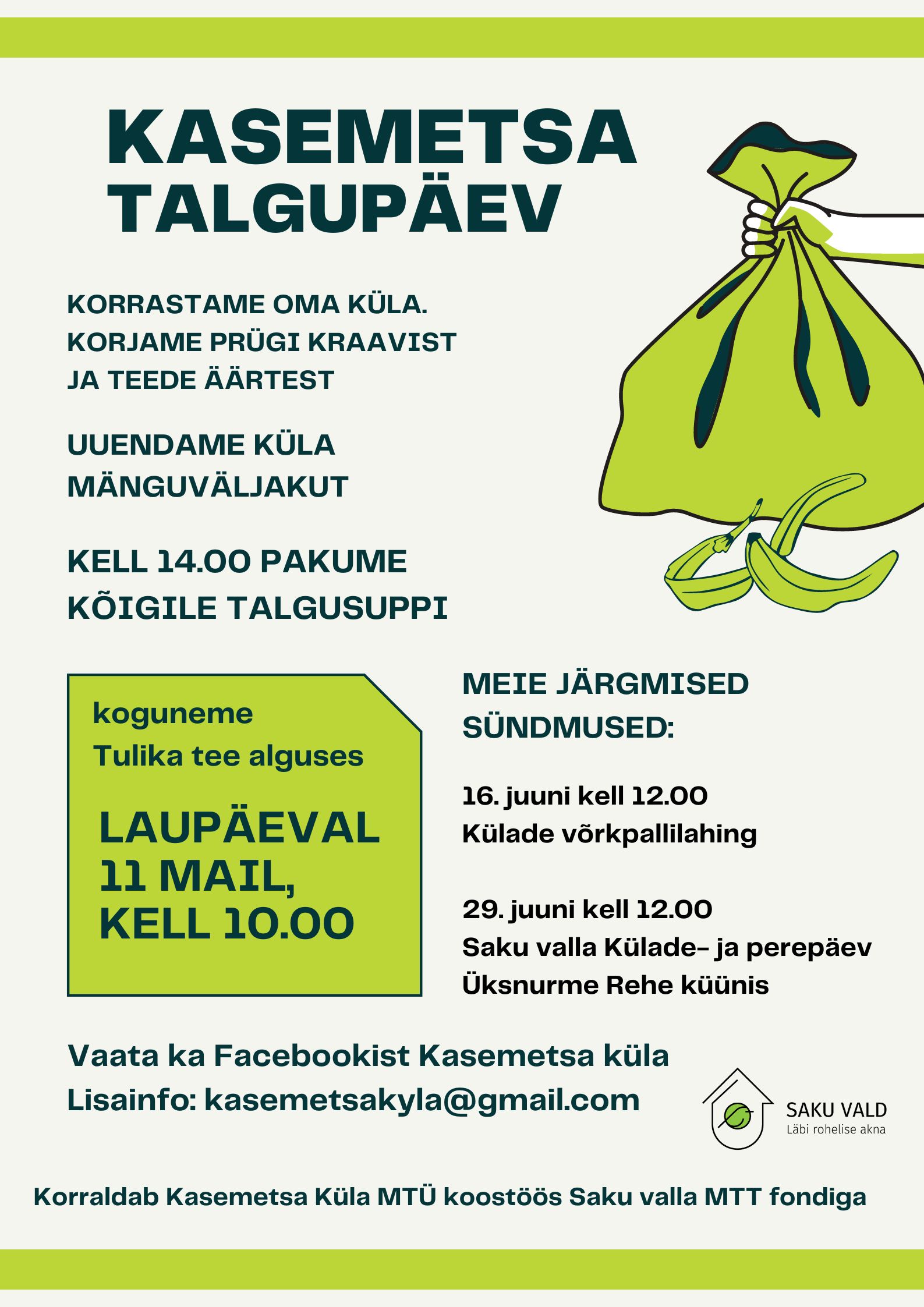 TasutaKorrastame küla teeääri ja kraave, uuendame mänguväljakut ja kell 14.00 kutsume kõiki osalejaid talgusupile.