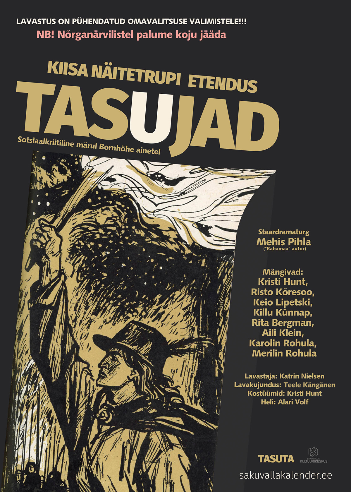 Mehis Pihla (NB! “Rahamaa” autor) “Tasujates” tegutsevad tuntud kuulsuse narride järeltulijad Tatikas jr jr ja Vesipruul jr jr, kes end ajakirjanduses ja tagatubades kui kalad vees tunnevad. Siiski ei kulge kõik nende plaani kohaselt. Kui spinndoktor keerab rahva seas üles Bornhöhe tasuja-sündroomi, pannakse ka Tatika ja Vesipruuli saatus noaterale. Millega märul lõpeb, jääb publiku otsustada – kas haarata hangu järele või leida ühine rütm ja jätkata lõputut tantsu omaenda naba ümber.