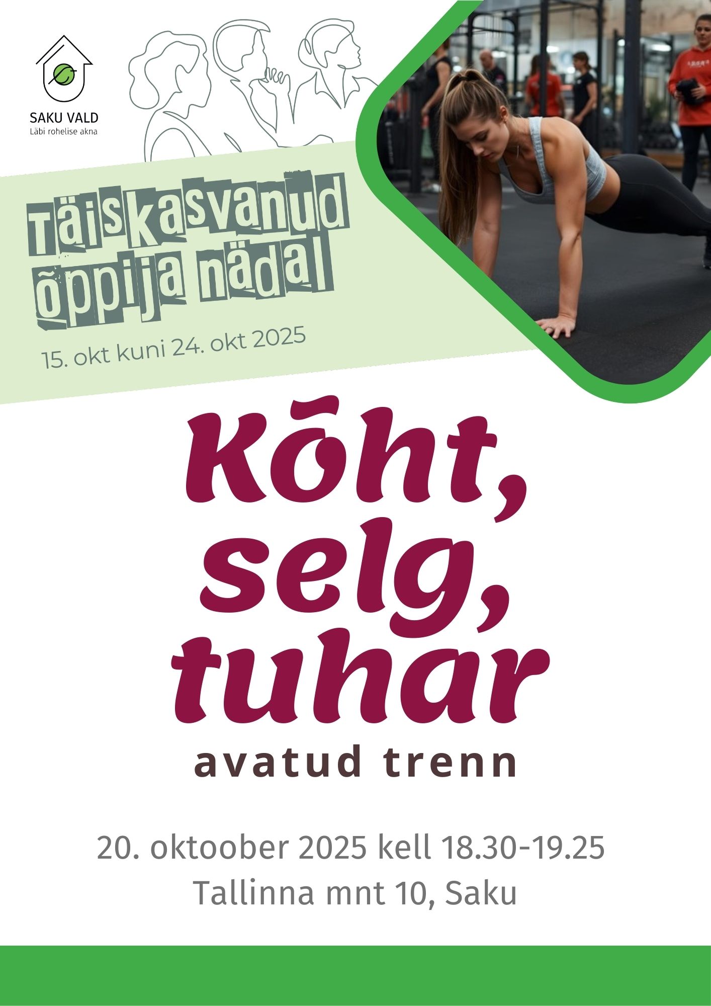 Avatud trenn toimub 20. oktoober 2025 kell 18.30 – 19.25 Saku valla Spordikeskuses, Tallinna mnt 10, Saku.