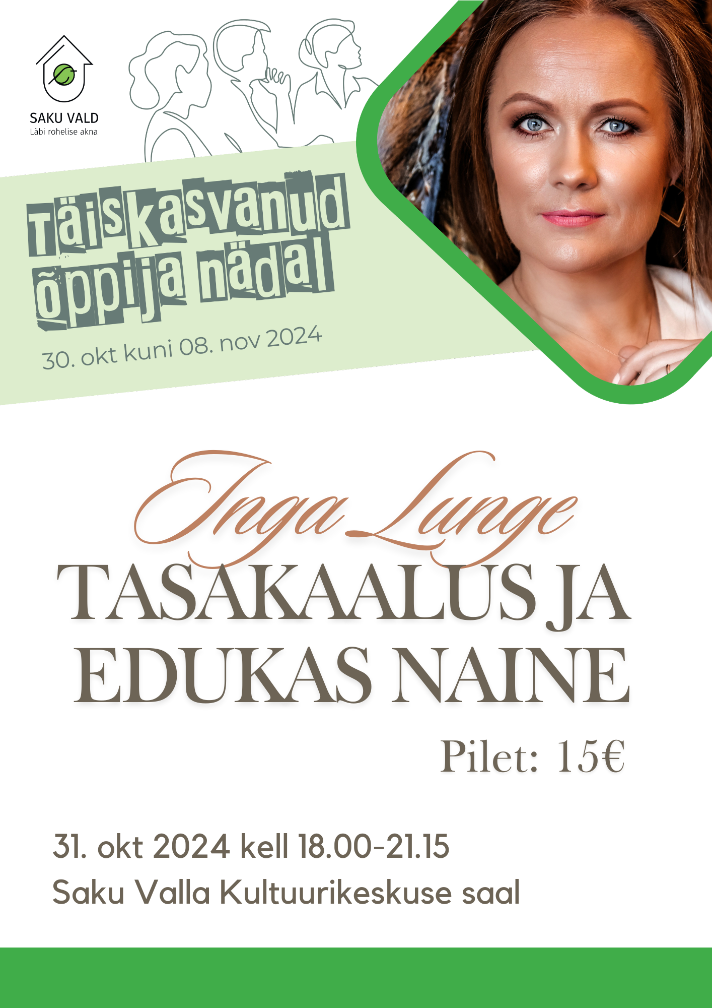 Pilet 15€ Peale registreerimist palume teha ülekanne kinnitamaks oma osalemist: Saaja: Saku Vallavalitsus ak EE862200001120079664. Selgitus: Koolitus tasakaalus ja edukas naine /osaleja ees- ja perekonnanimi/Naistel on kombeks ennast sättida tagaplaanile. Kas ennast ära kaotades on naistest päriselt abi? Milliseid käitumismustreid paljundatakse sel viisil järgnevatele põlvedele? Enda vaimse tervise esikohale seadmine pole mitte egoism, vaid vastutus eelkõige enda ja tulevaste põlvede ees ning toob kasu nii igapäevatöös kui pereelus. Energia, mis jääb üle pidevast võitlemisest, muretsemisest, kannatamisest on võimalik suunata uue ja toetava rajamisele. Töökohustused ja „pean ülesanded“ on võimalik enda kasuks (mitte enda vastu) tööle panna. Iga naine on oluline ja väärtuslik!