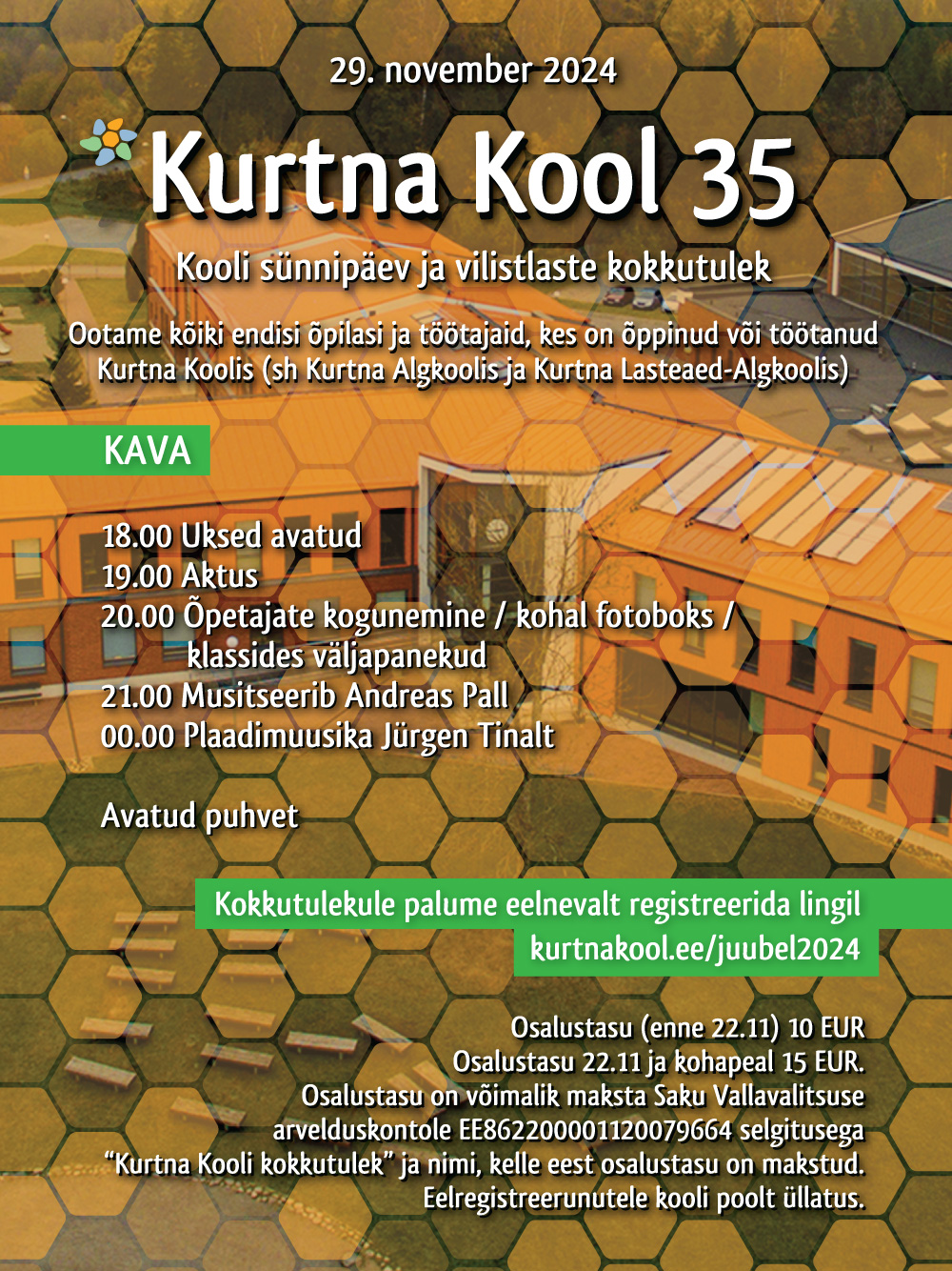 Kokkutulekule palume eelnevalt registreerida lingil https://kurtnakool.ee/juubel2024/ Osalustasu (enne 22.11) 10 EUR Osalustasu 22.11 ja kohapeal 15 EUR. Osalustasu on võimalik maksta Saku Vallavalitsuse arvelduskontole EE862200001120079664 selgitusega Kurtna Kooli kokkutulek ja nimi, kelle eest osalustasu on makstud. Eelregistreerunutele kooli poolt üllatus.
