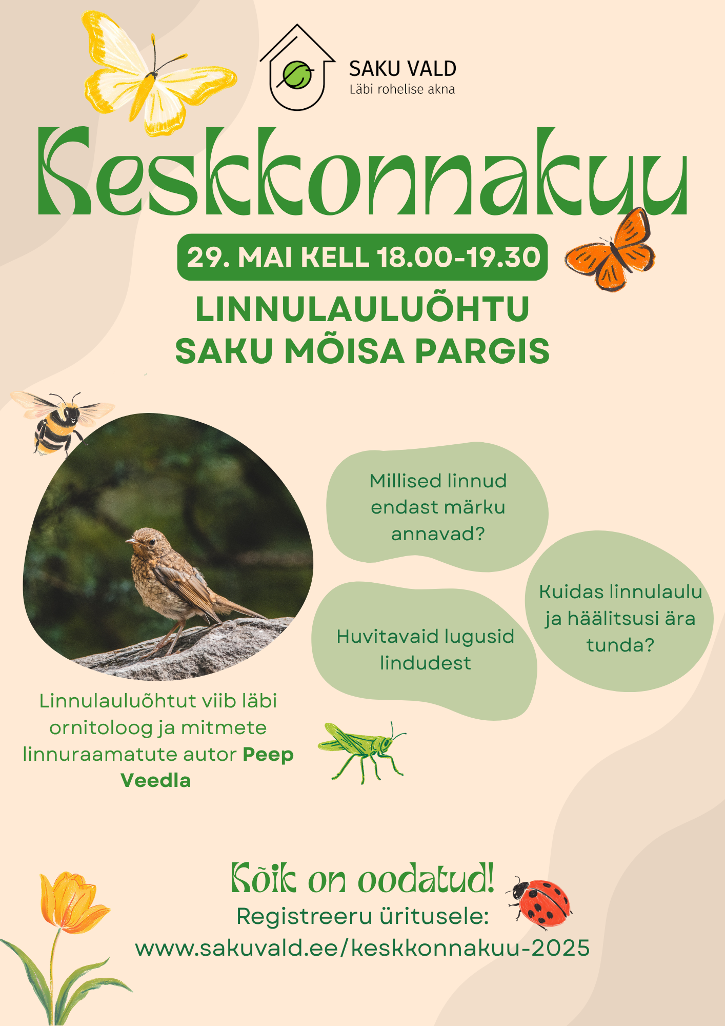 TasutaMitmete linnuraamatute autor Peep Veedla räägib Saku mõisa pargis just neist lindudest, kes end parasjagu näitavad või lauluga ja muude häälitsustega endast märku annavad. Peep jagab nippe, kuidas üht või teist laulu ja häälitsust meelde jätta ning edaspidi ära tunda. Ühtlasi räägib ta nende lindude kommetest ja suhetest inimestega, erinevate maade rahvastega. Kuulaja saab teada, milliseid linde on valitud eri maades rahvus- ja sümbollindudeks, mida on arvanud erinevatest lindudest vanad eestlased jpmt. Mõne linnu kohta kuulete ka luuletust, neid on Peep kirjutanud enam kui saja linnuliigi kohta.