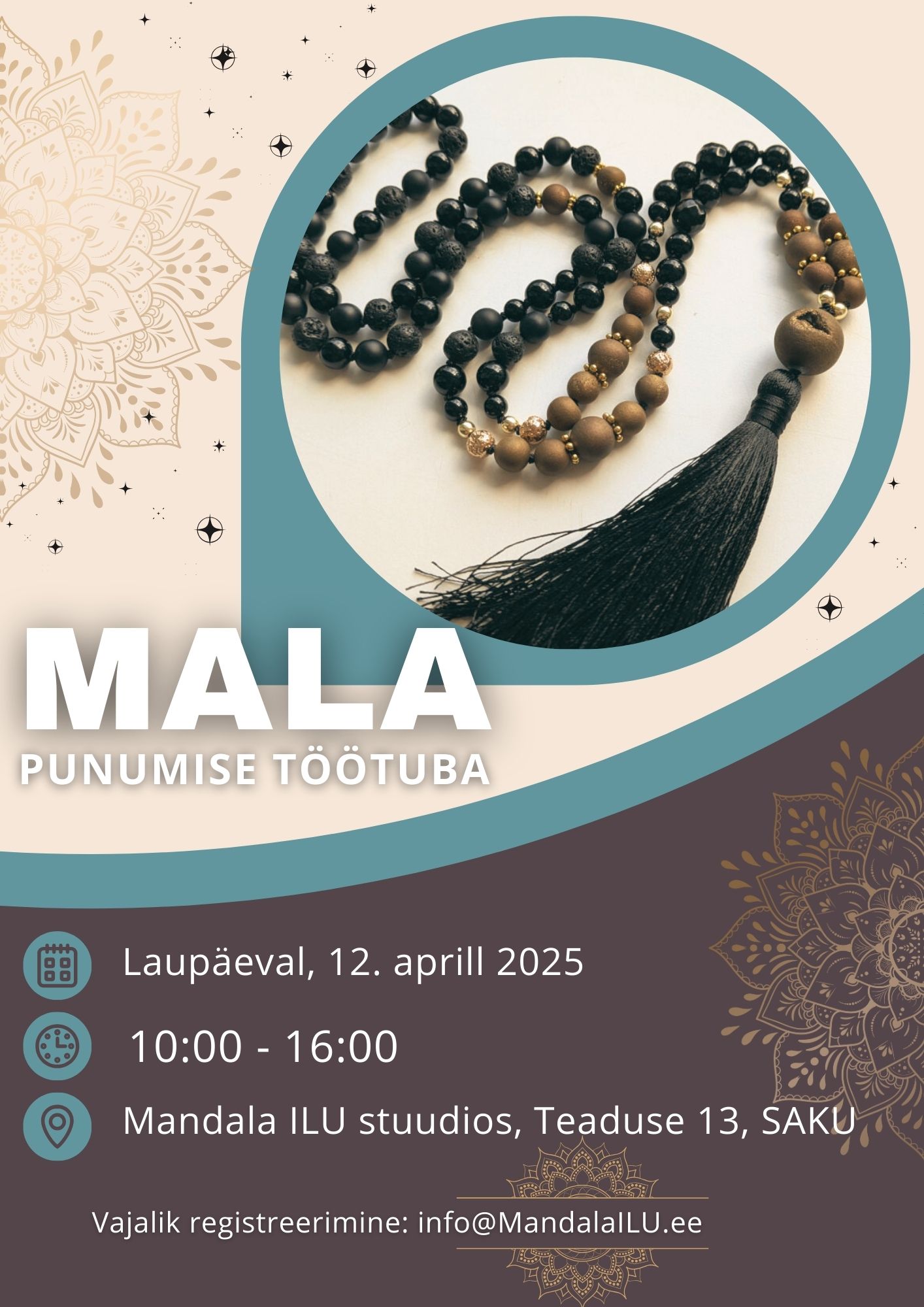 - Koha töötoas tagab 30€ ettemaks (mille tagastan, kui teatad oma mitte osalusest vähemalt 24h enne töötoa algust). Eelbroneeringut ootan: MTÜ Mandala ILU / EE272200221070530981 / tekst: Mala töötuba 12.04.25 ja Sinu nimi. Ülejäänud summa kas kohapeal sulas või ülekandega. Arve soovist anna mulle julgelt teada. Kõik on võimalik.