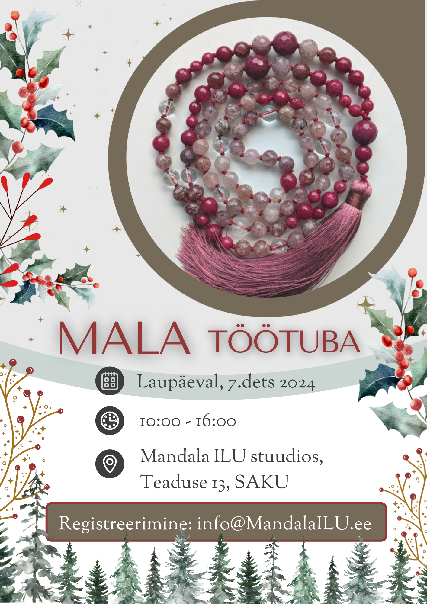 - Koha töötoas tagab 30€ ettemaks (mille tagastan, kui teatad oma mitte osalusest vähemalt 24h enne töötoa algust). Eelbroneeringut ootan: MTÜ Mandala ILU / EE272200221070530981 / tekst: Mala töötuba 07.12.24 ja Sinu nimi. Ülejäänud summa kas kohapeal sulas või ülekandega. Arve soovist anna mulle julgelt teada. Kõik on võimalik.