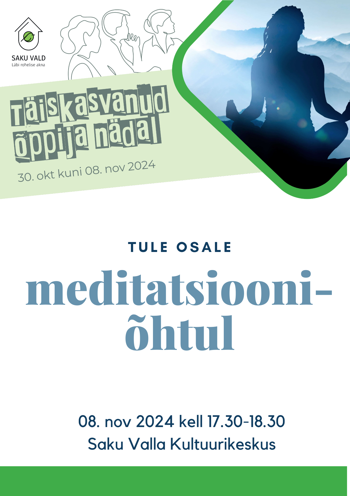 Meditatsiooni saad proovida 08.novembril 2024 kell 17.30 Saku Valla Kultuurikeskuse ruumis 111, Teaduse 1, Saku. Selga tuleks panna mugavad riided ja kaasa võtta matt. Palume kohale tulla 10 minutit varem.