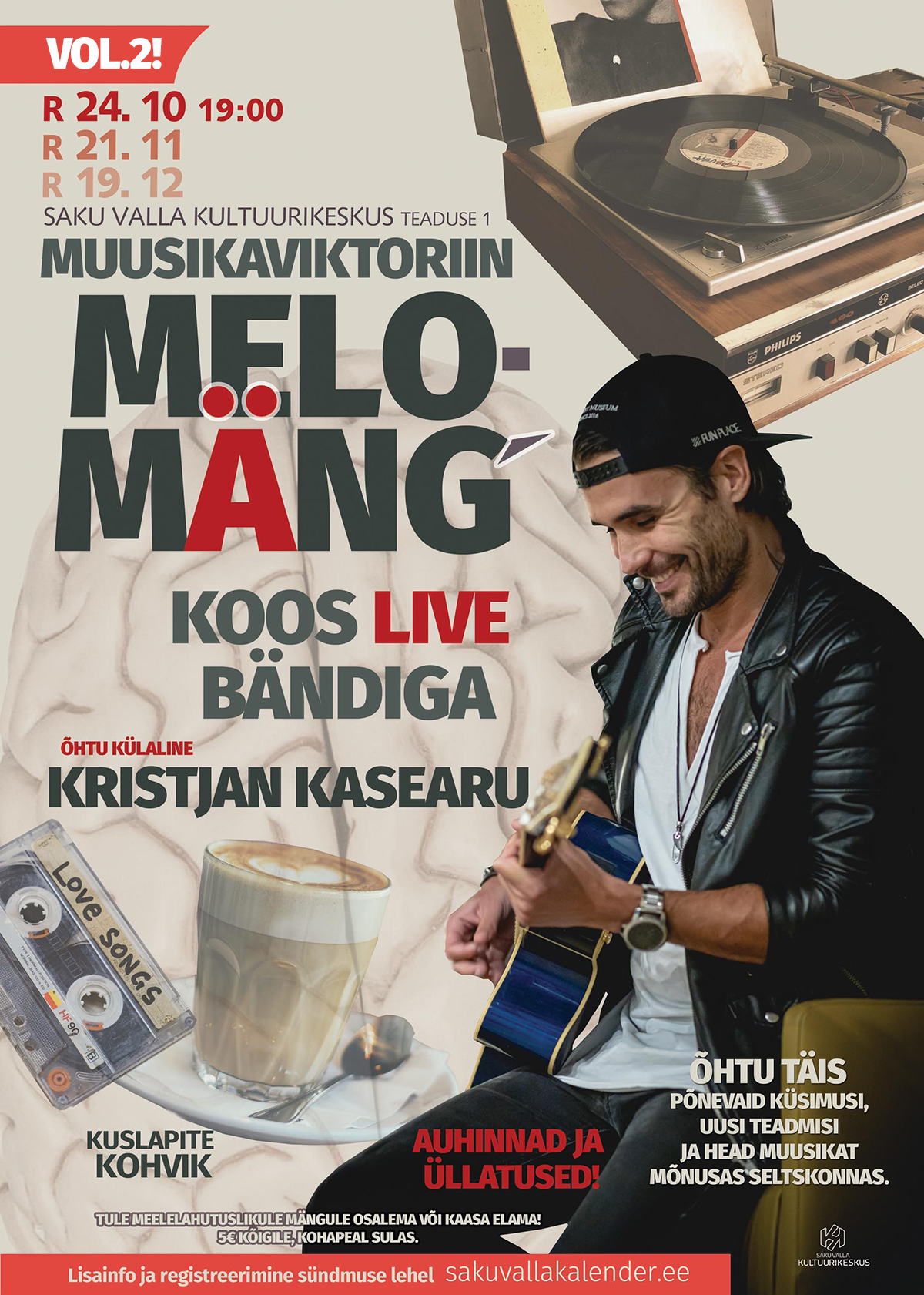 5€ osalejale ja publikule, kohapeal sulas.Meelelahutuslik muusikaviktoriin MELOMÄNG, koos live bändiga! VOL.2