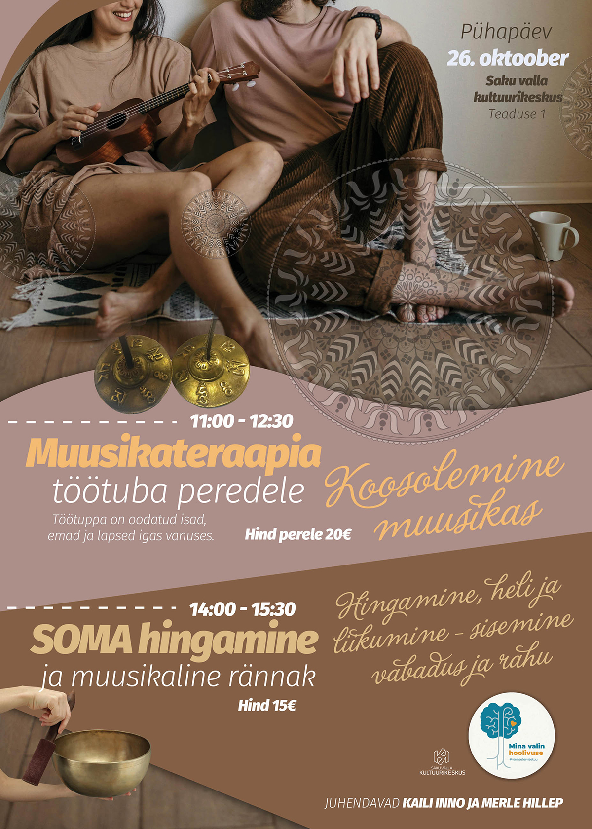 Vaimse tervise päeval ootame Sind ja Su peret muusikateraapia töötuppa, kus muusika aitab meil üksteist paremini märgata, kuulata ja väärtustada.