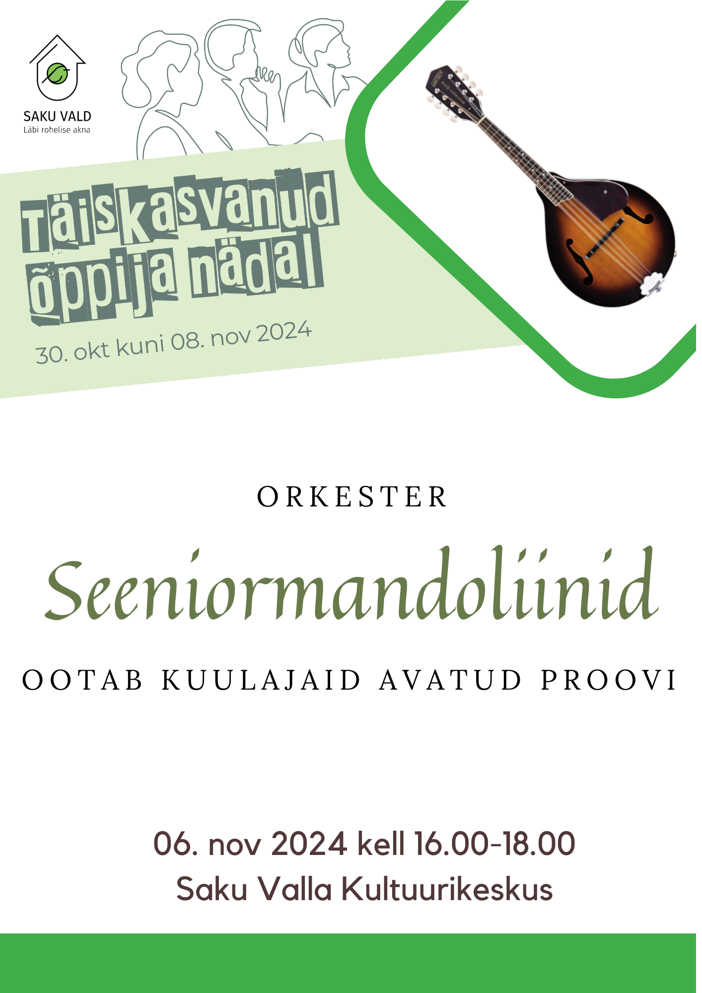 Tasuta. Vajalik etteregistreerimine.Täiskasvanud õppija nädala raames toimub orkestri Seeniormandoliinid avatud proov.