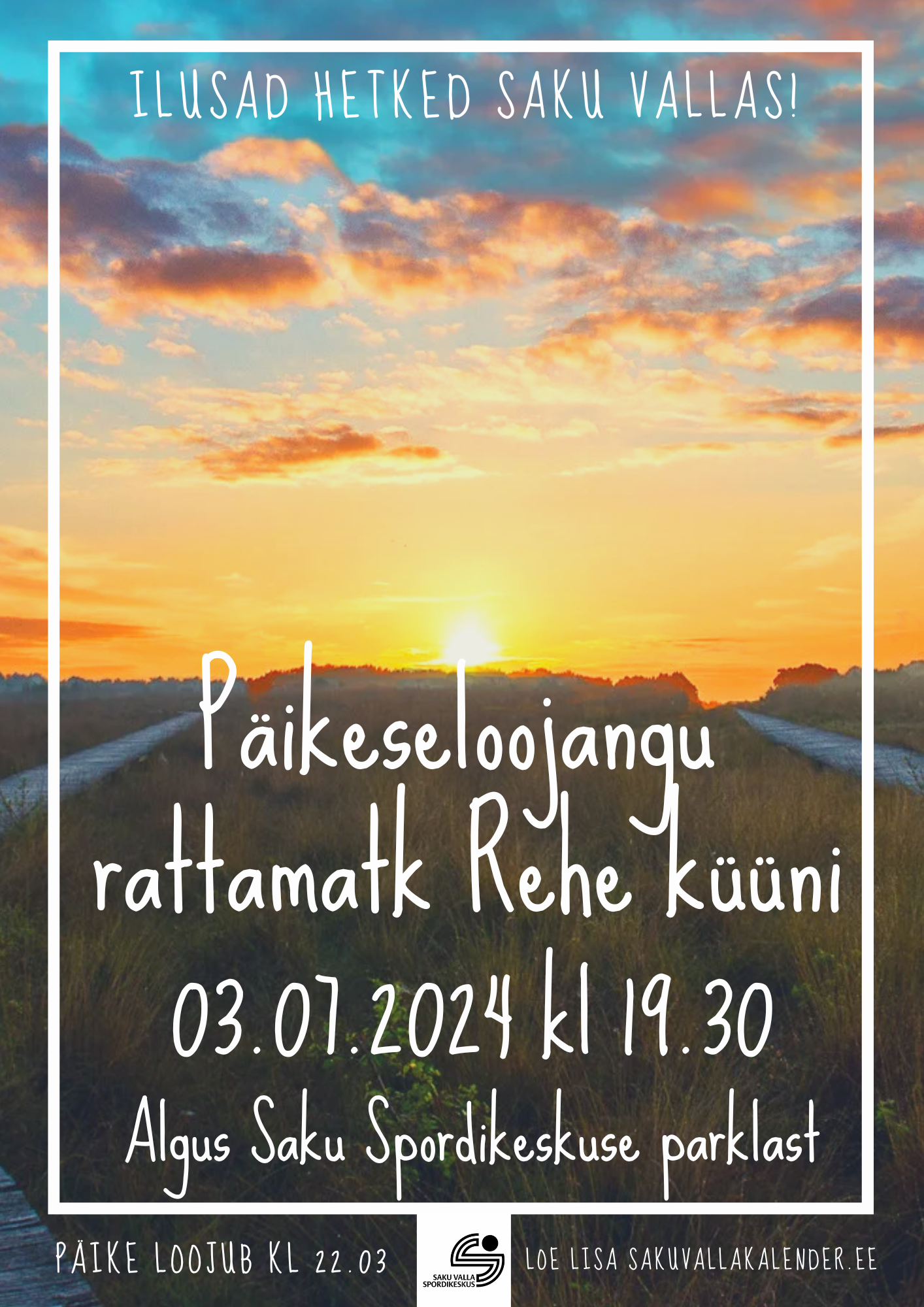 Oled kogu perega ja sõpradega oodatud #sakuliigub päikeseloojangu rattamatkale, mis viib meid Sakust Kasemetsa, Metsanurme ning sealt edasi Üksnurme Rehe küüni alale päikeseloojangu piknikule.