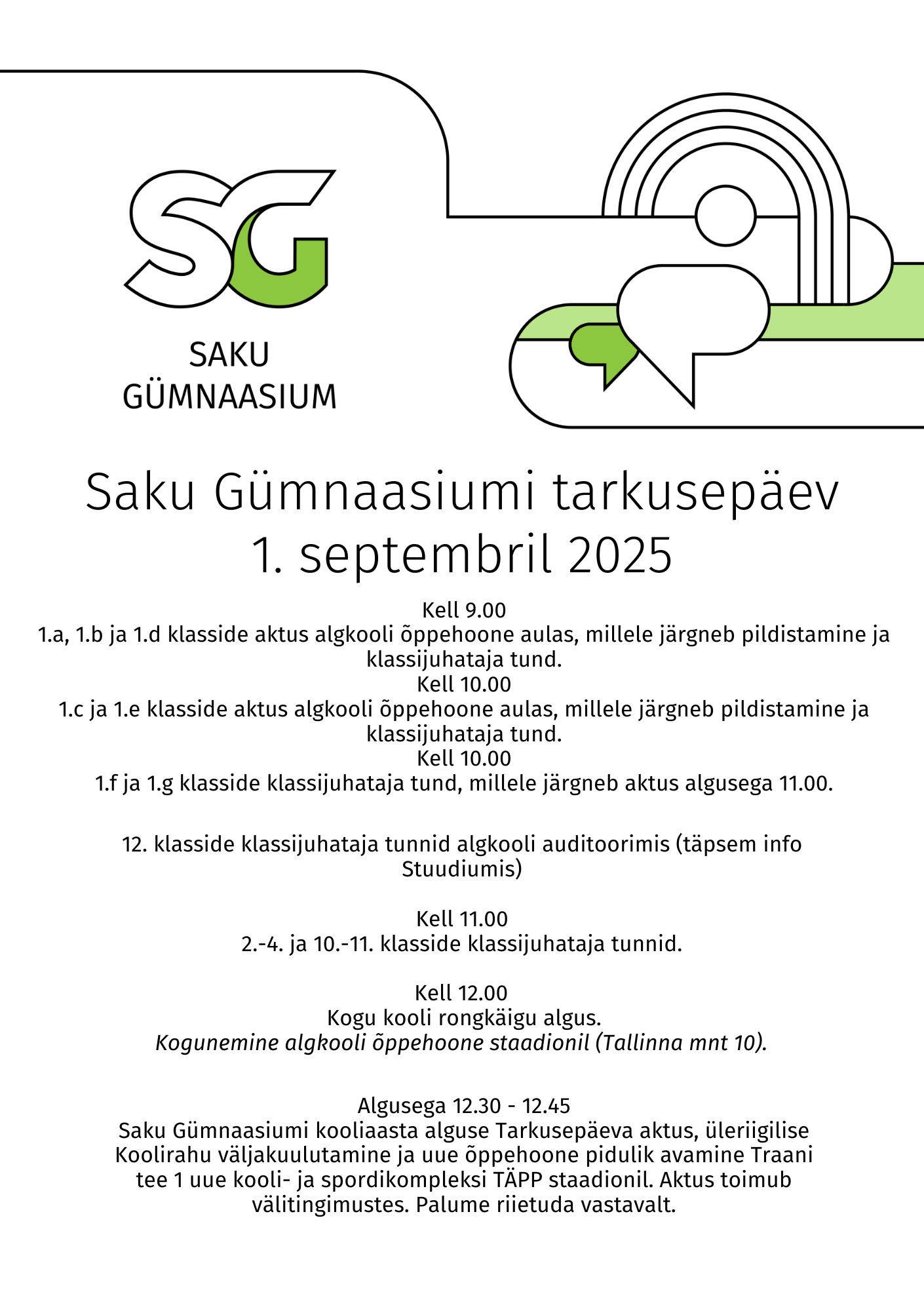 Saku Gümnaasiumi kooliaasta alguse Tarkusepäeva aktus, üleriigilise Koolirahu väljakuulutamine ja uue õppehoone pidulik avamine Traani tee 1 uue kooli- ja spordikompleksi TÄPP staadionil. Aktus toimub välitingimustes. Palume riietuda vastavalt.