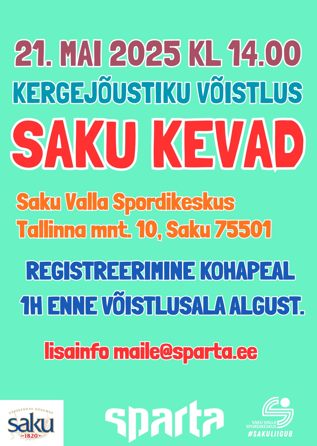 TASUTA21.mai 2026 ootame kõiki Saku valla koolide ja spordiklubide lapsi Saku Spordikeskuse staadionile osalema Saku Kevad laste kergejõustikuvõistlusel.