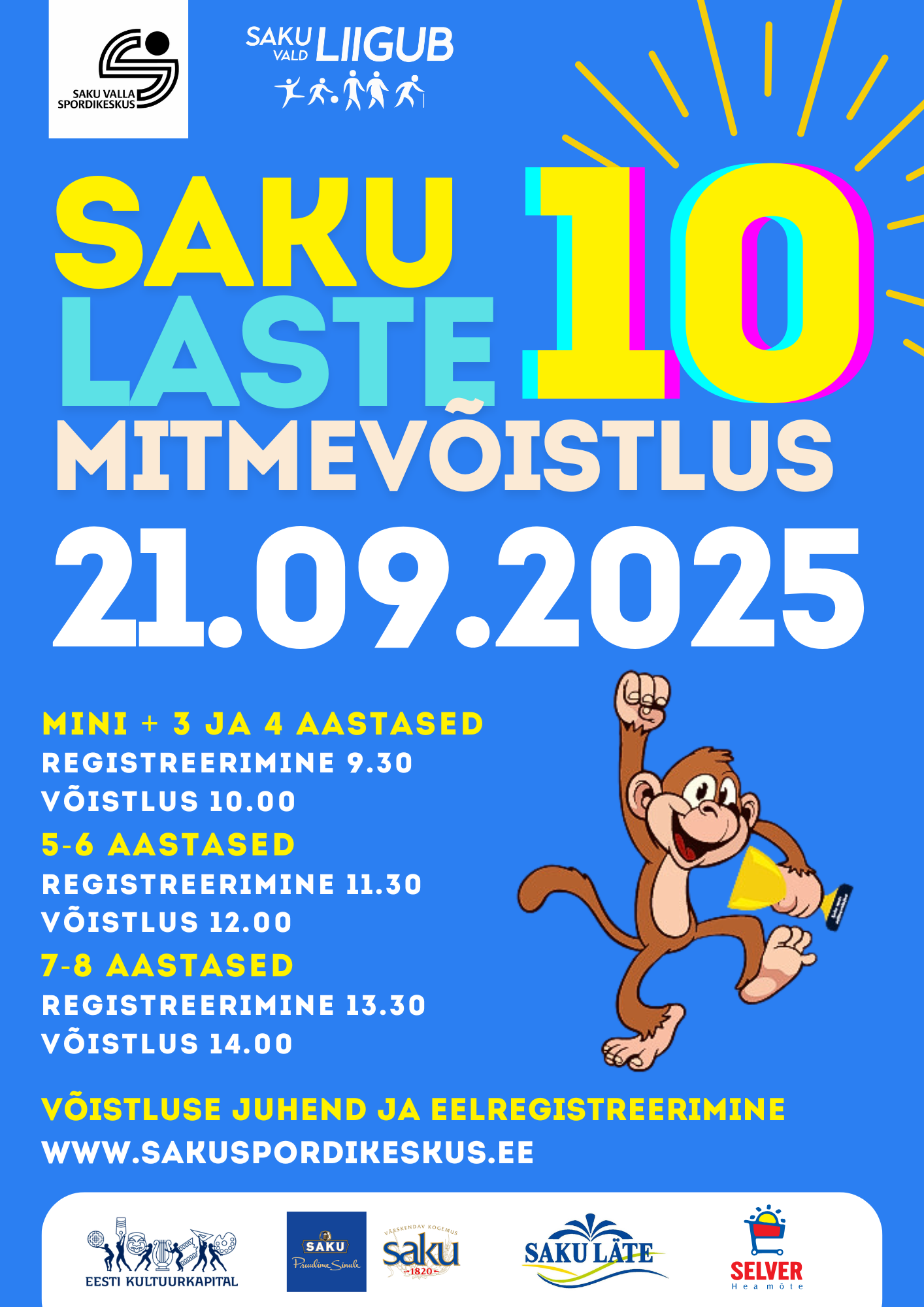 Eelregistreerimine tasuta, kohapeal 5 € sularahas21.09.2025 toimub traditsiooniline Saku laste mitmevõistlus juba 10. korda ja ootame kõiki mudilasi koos peredega Saku koolistaadionile (Tallinna mnt.10, Saku).