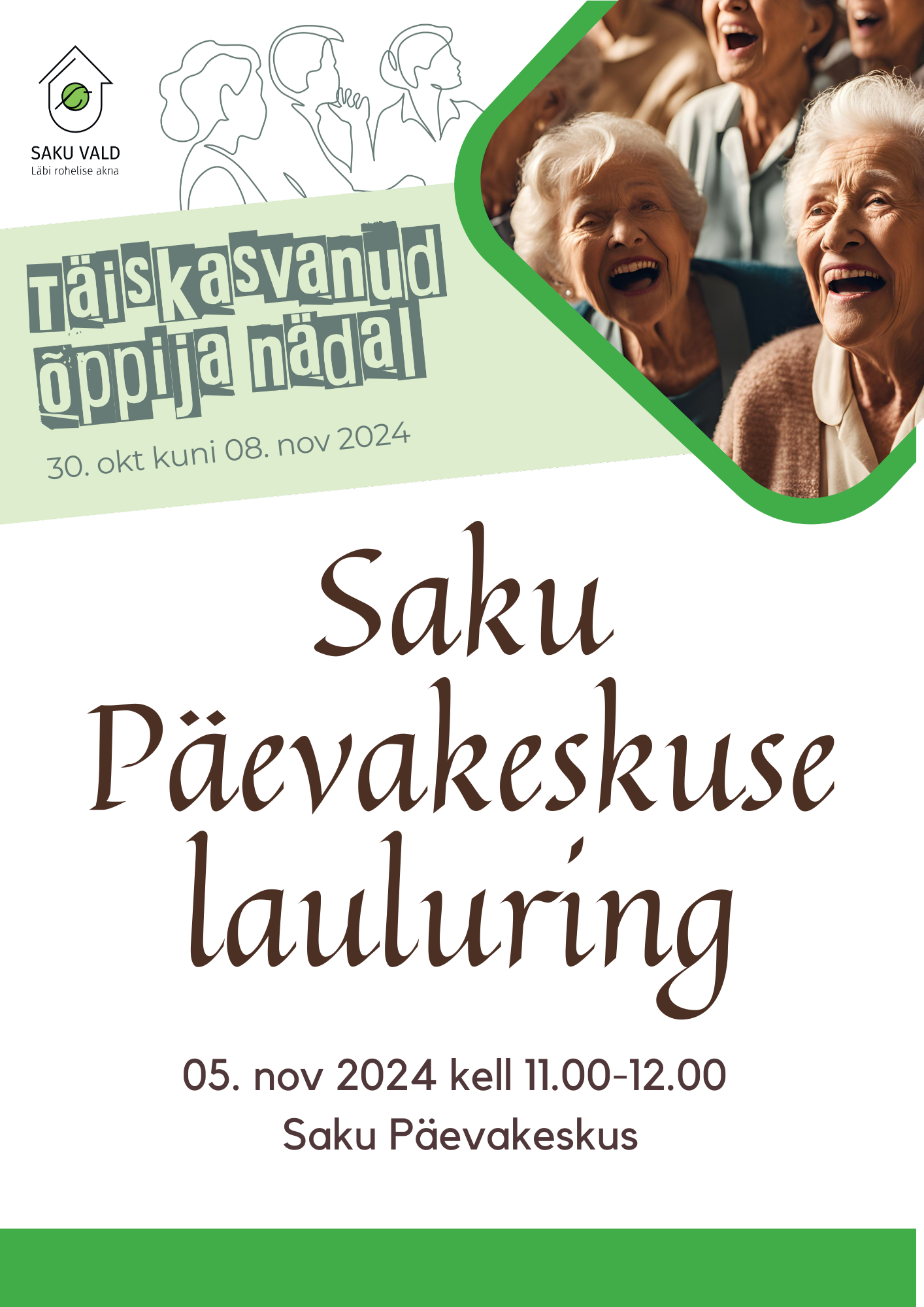 Tasuta. Vajalik etteregistreerimine.Täiskasvanud õppija nädala raames toimub Saku Päevakeskuse lauluringi avatud kooslaulmine.