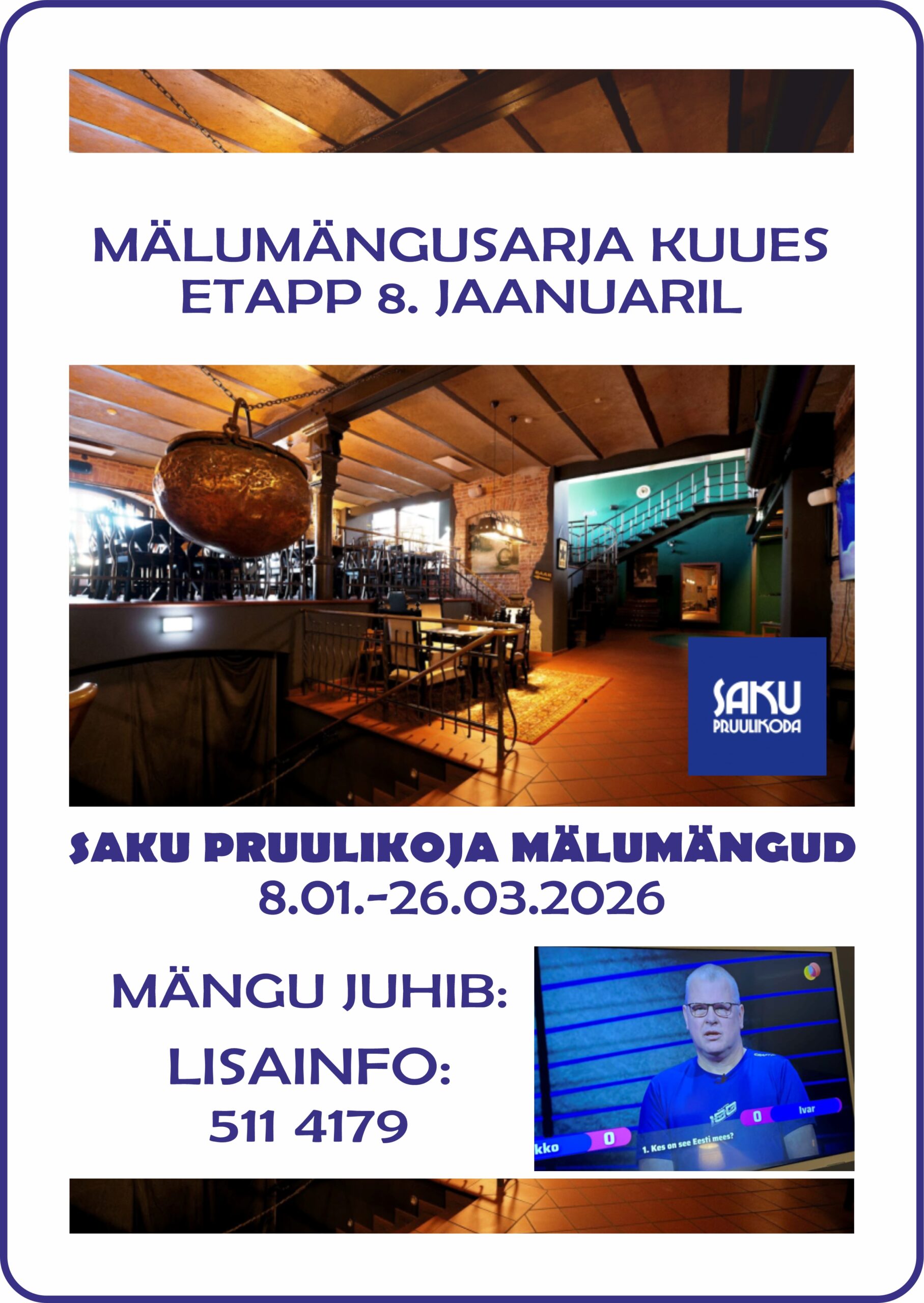 Osalustasu 5€ kohapealSaku Pruulikoja Pubis toimub üle nädala neljapäeviti mälumängusari, mille küsimused on seinast seina, ehk osaleda võib ja saab igaüks. Lõbus mäng kestab kaks tundi ja kui ei tule ka võit, siis targemaks saavad kõik!