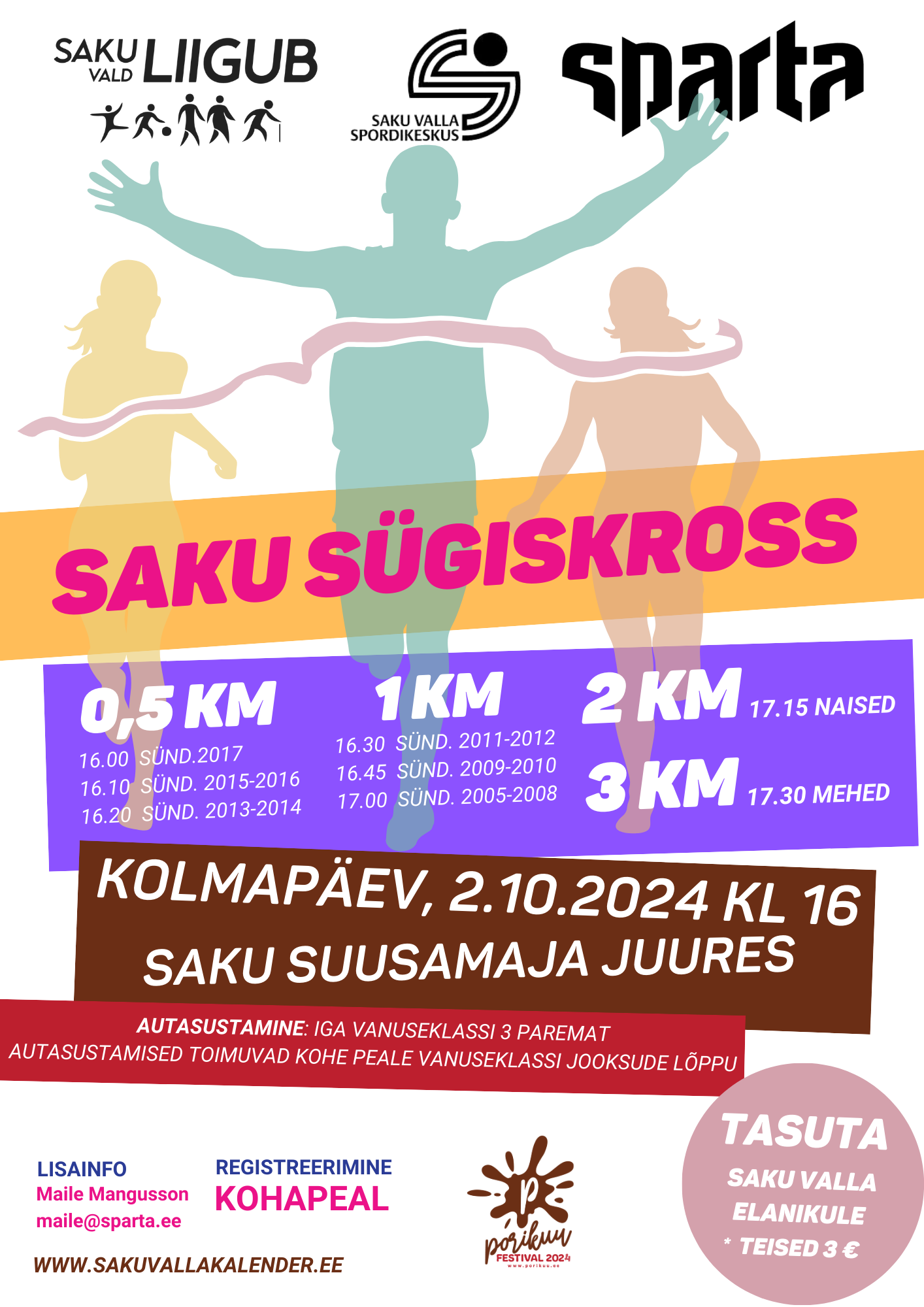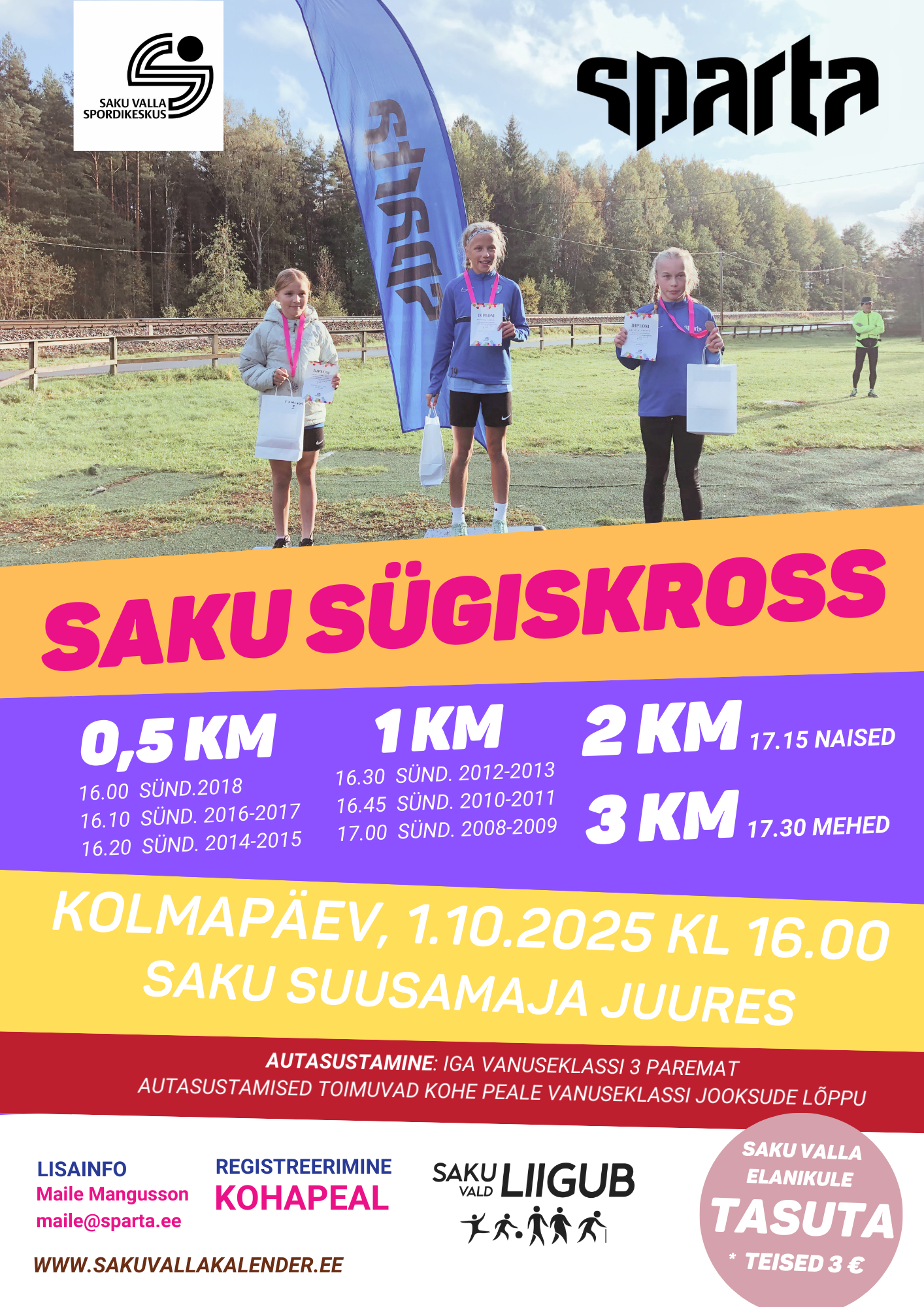 Valla elanikele tasuta! Külalistele 3 € kohapeal sularahas.SAKU SÜGISKROSS 2025 toimub 1.oktoober Saku terviseradadel!