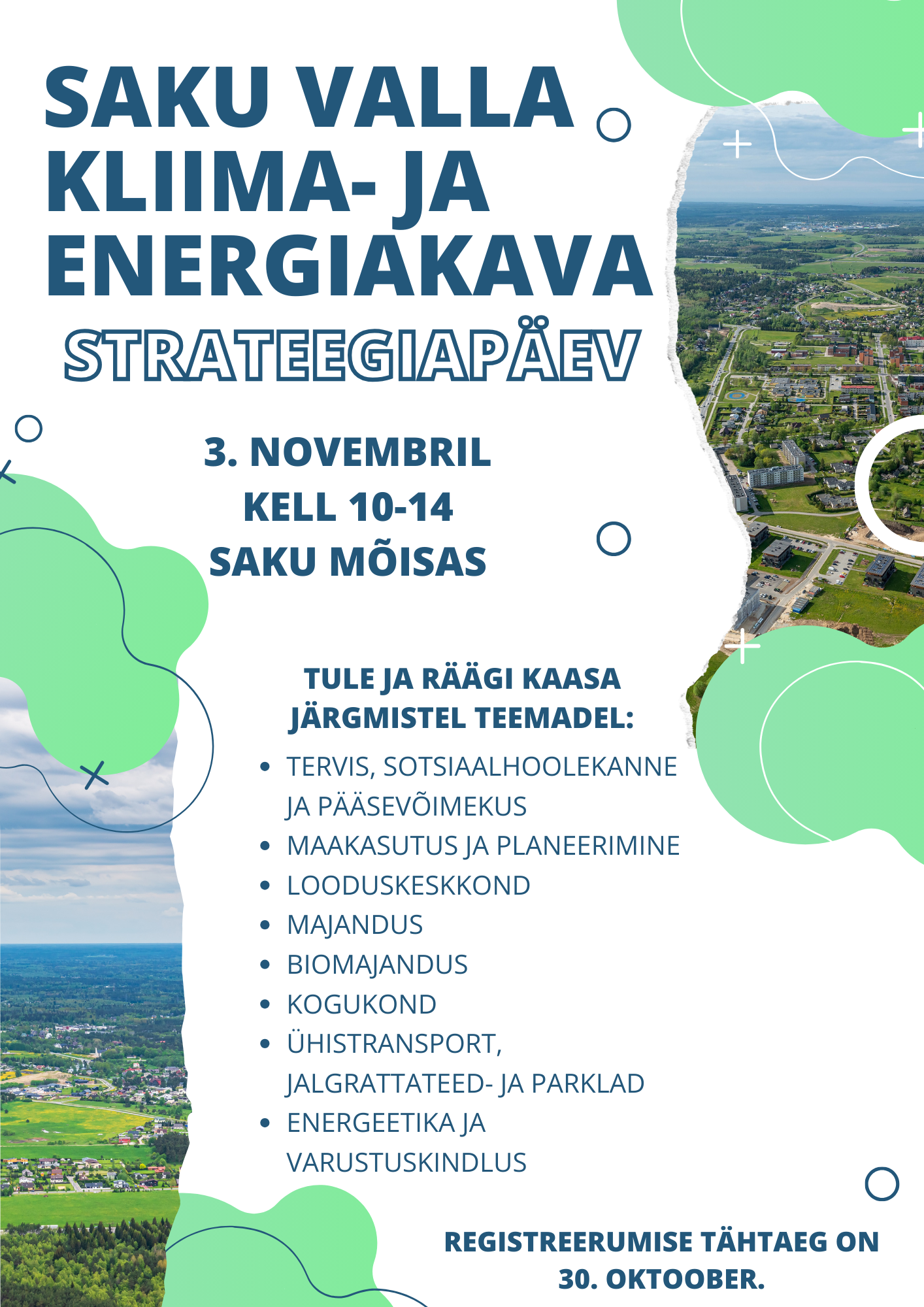 Olete oodatud Saku valla kliima- ja energiakava strateegiapäevale 3. novembril kell 10 Saku Mõisa.