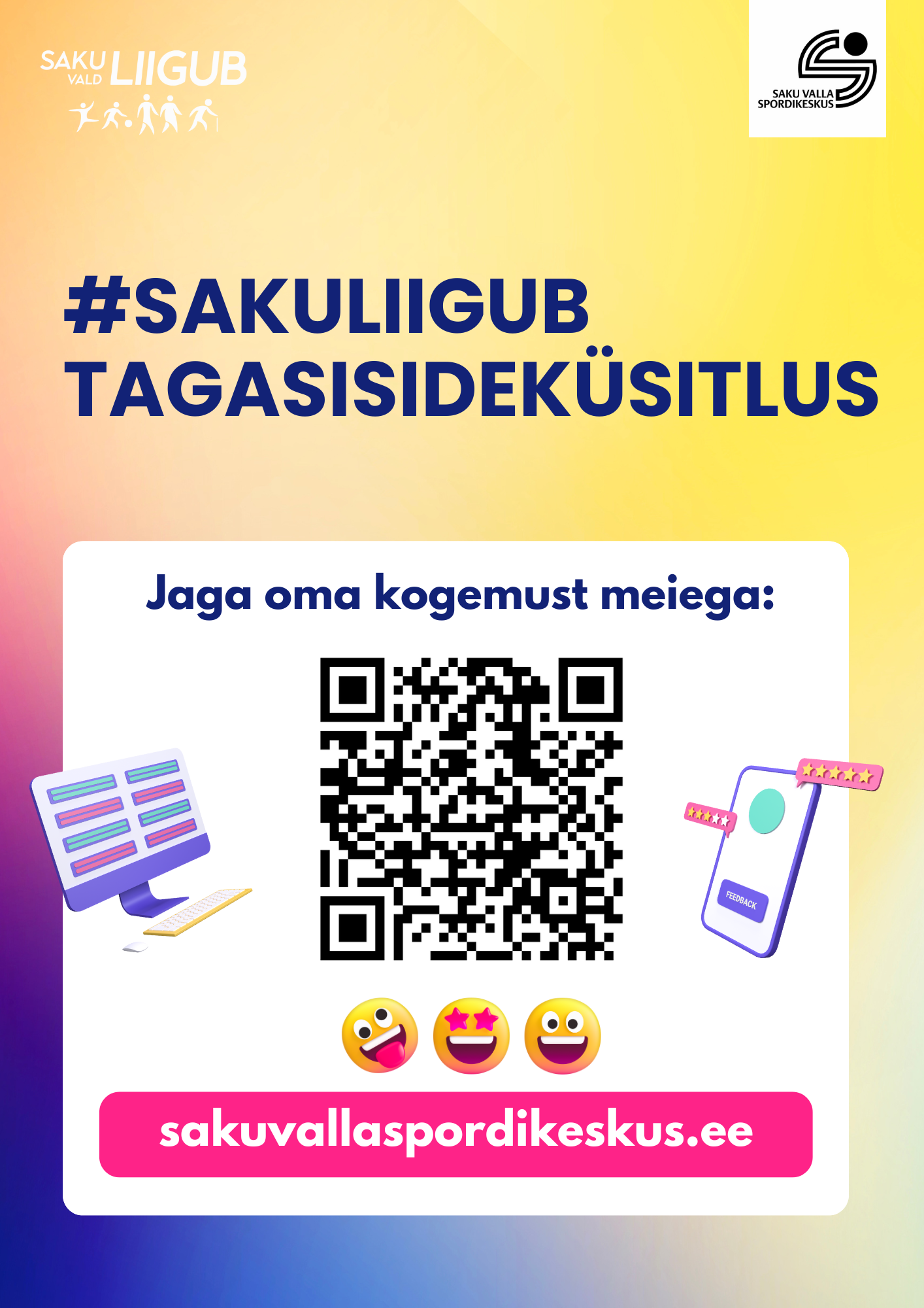Täida ankeet ja võid osaleda auhinnaloosis!Olete jõudnud Saku Valla Spordikeskuse #sakuliigub projekti tagasisideküsitluse lehele, mille täitmine võtab aega kuni 5 minutit. Selle küsimustiku eesmärk on koguda tagasisidet, mis aitab #sakuliigub üritusi paremaks muuta. Ole hea ja anna meile tagasisidet!