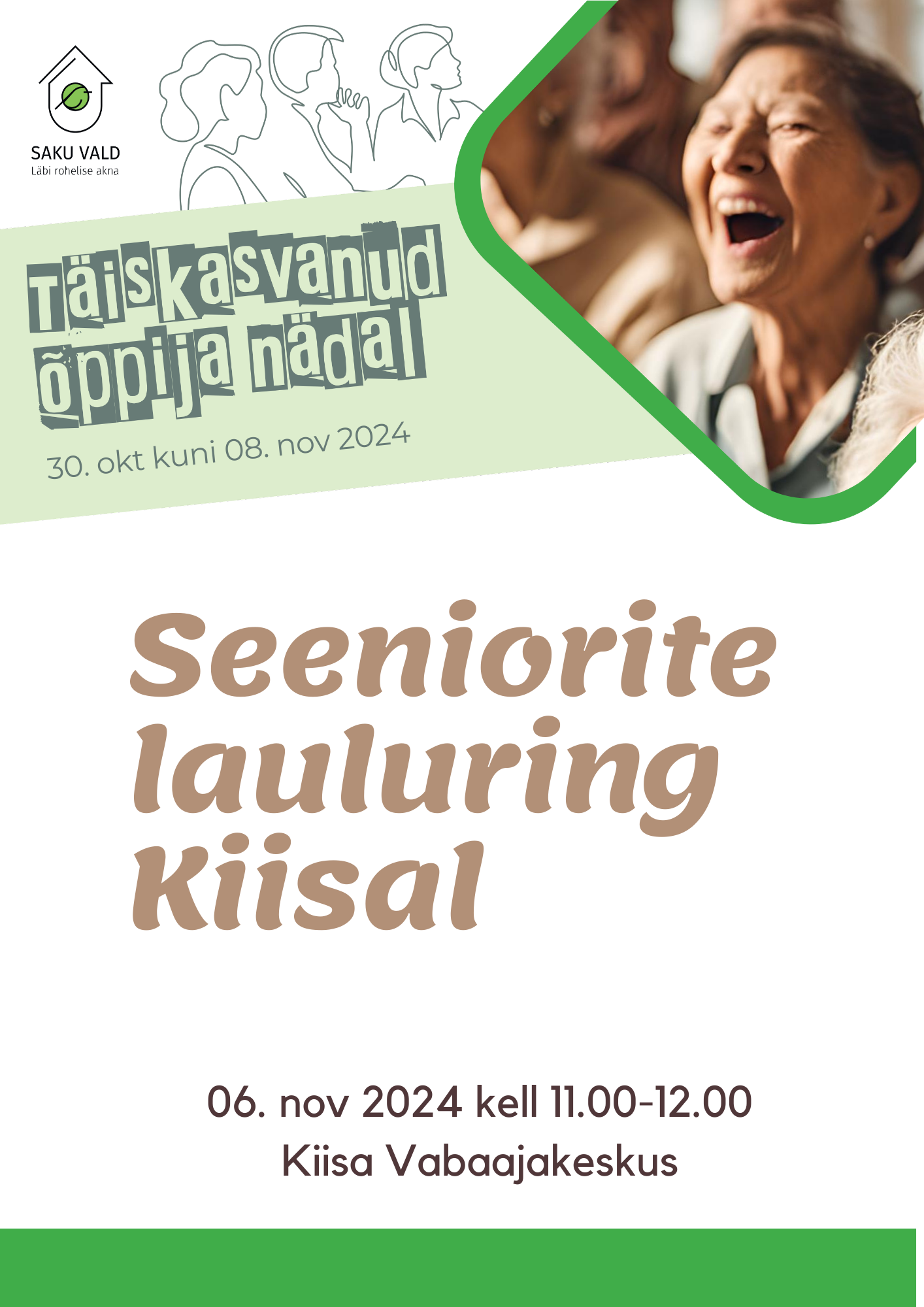 Tasuta. Vajalik etteregistreerimine.Täiskasvanud õppija nädala raames toimub avatud kooslaulmine Seeniorite lauluringis Kiisal. Lauluringi juhendajaks on Urmi Sinisaar.