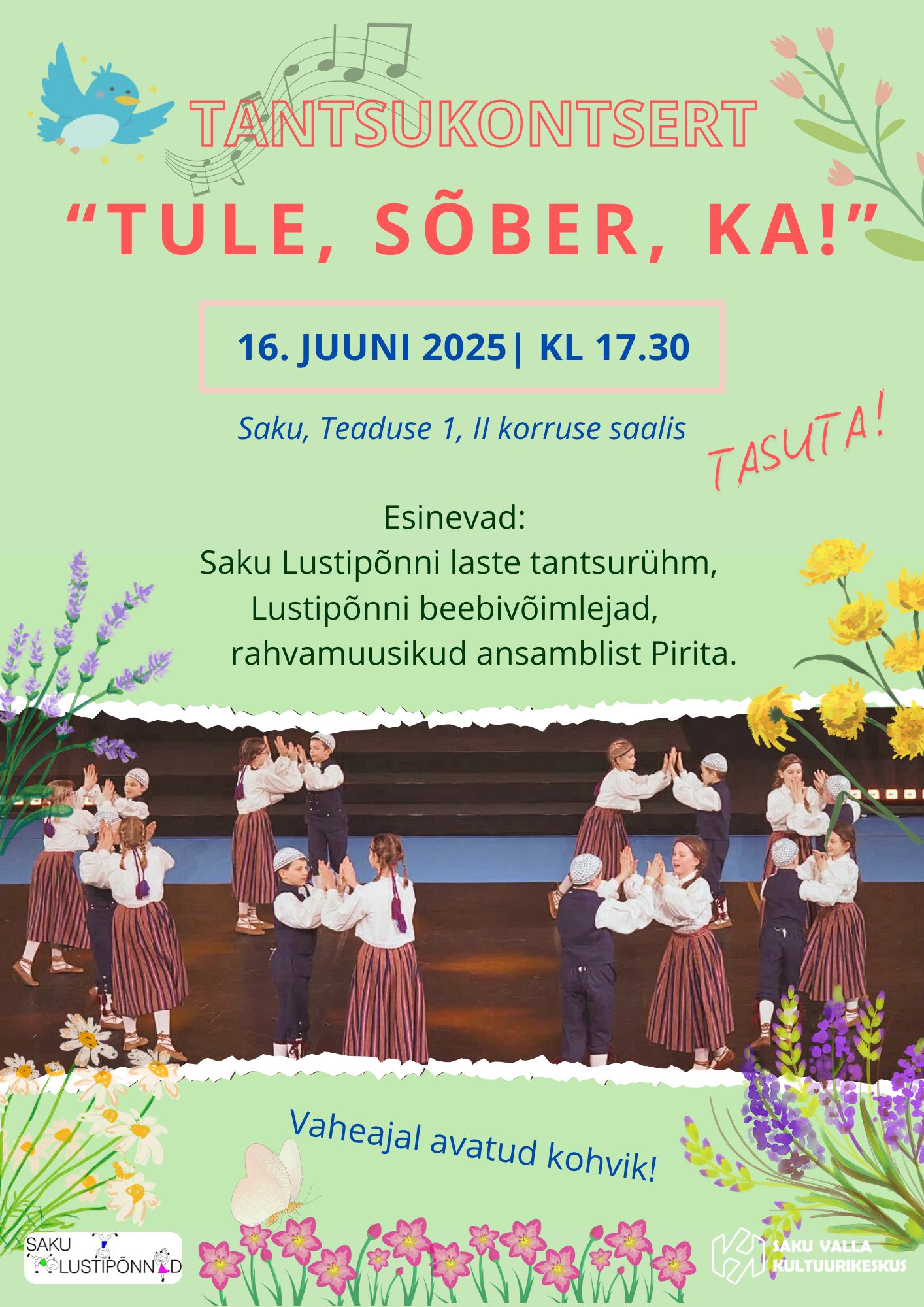 Kontserdil saab näha eriilmelisi tantse laste tantsurühma Lustipõnnid esituses, lisaks esinevad Lustipõnni beebivõimlejad. Tantsijad on vanuses 0-12 a. Kaasa löövad ka muusikud rahvamuusikaansamblist Pirita.