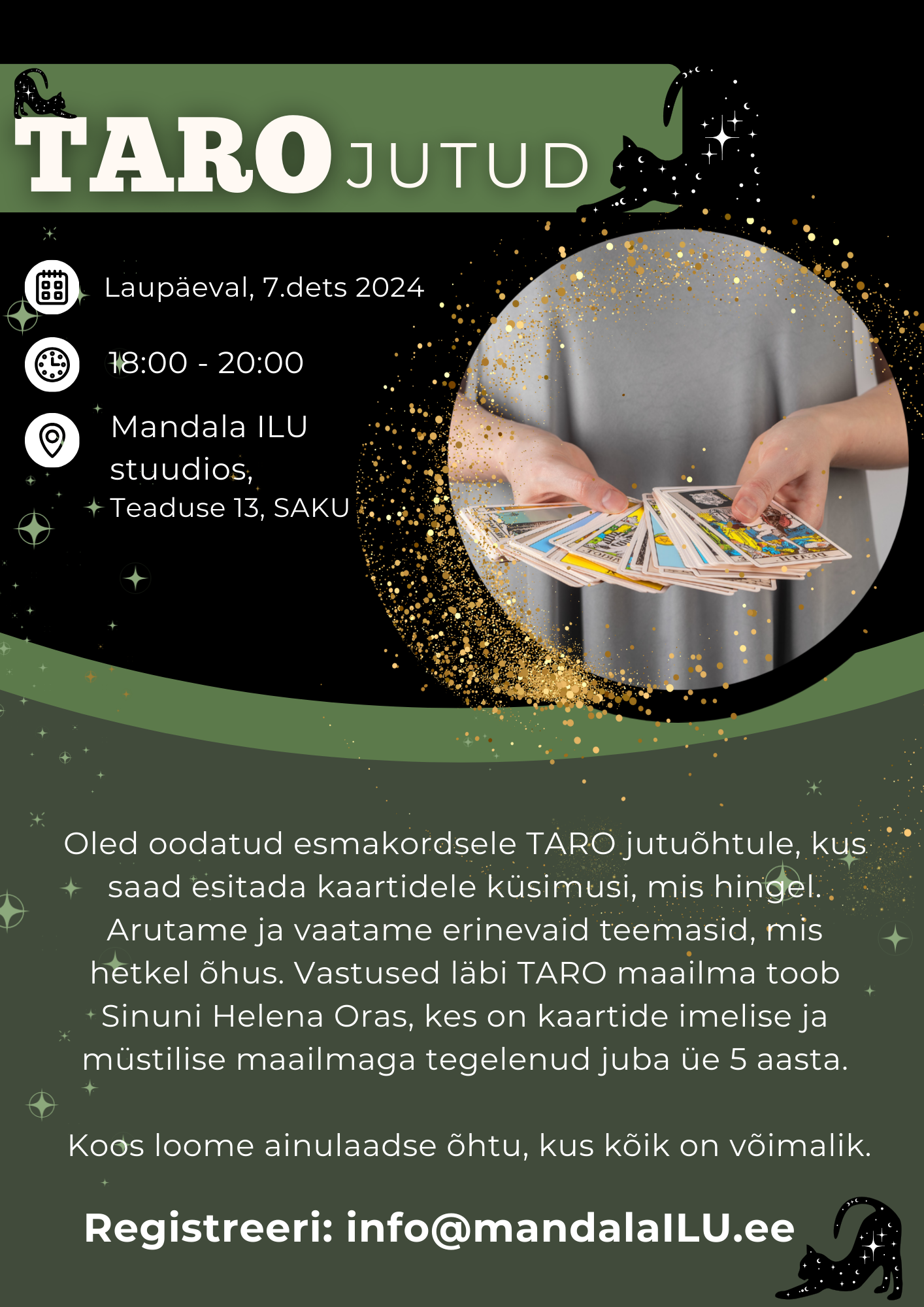 20€Oled oodatud esmakordsele TARO jutuõhtule, kus saad esitada kaartidele küsimusi, mis hingel. Arutame ja vaatame erinevaid teemasid, mis hetkel õhus. Vastused läbi TARO maailma toob Sinuni Helena Oras, kes on kaartide imelise ja müstilise maailmaga tegelenud juba üe 5 aasta. Koos loome ainulaadse õhtu, kus kõik on võimalik.