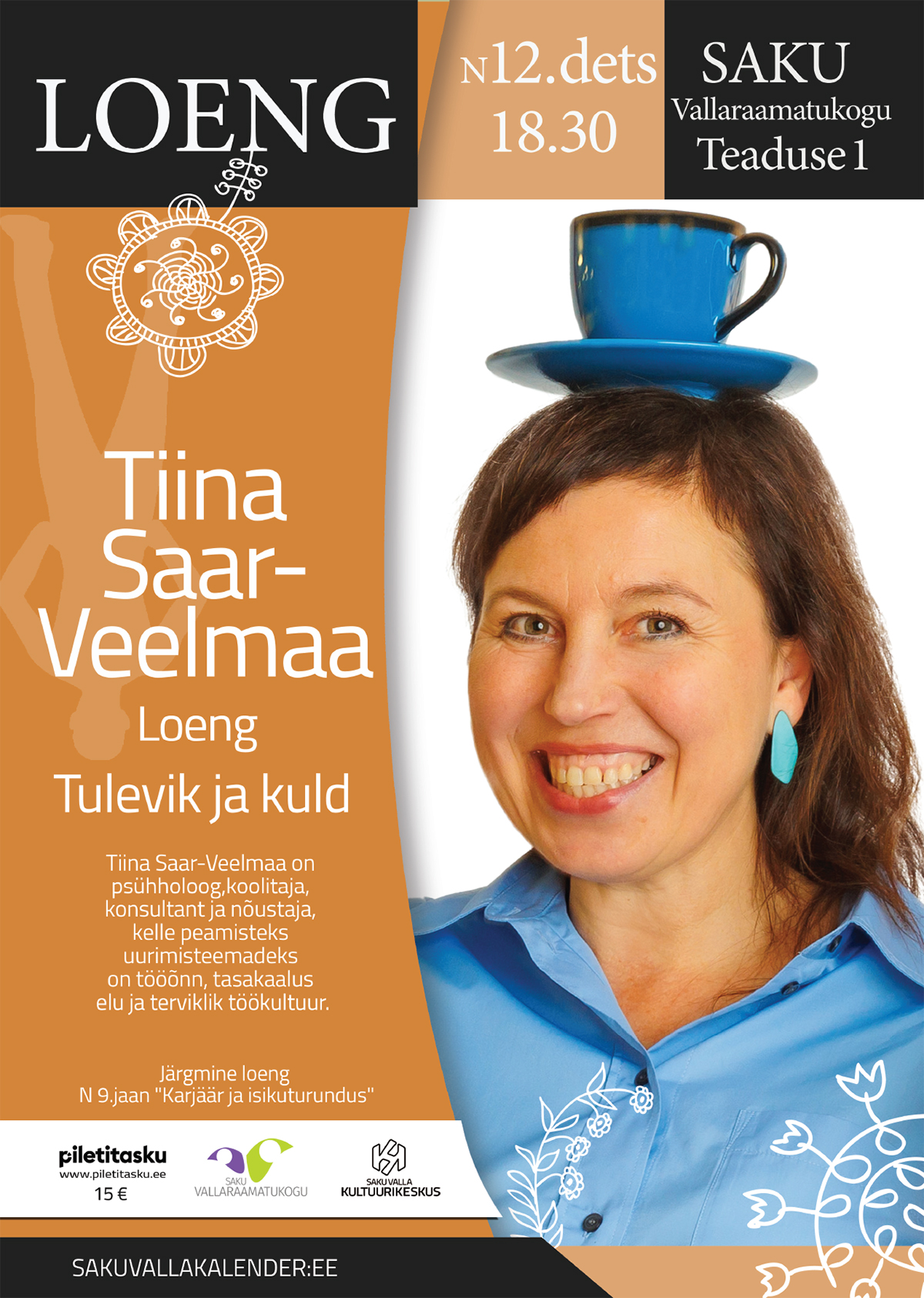 Tiina Saar-Veelmaa on psühholoog, koolitaja, konsultant ja nõustaja, kelle peamisteks uurimisteemadeks on tööõnn, tasakaalus elu ja terviklik töökultuur.