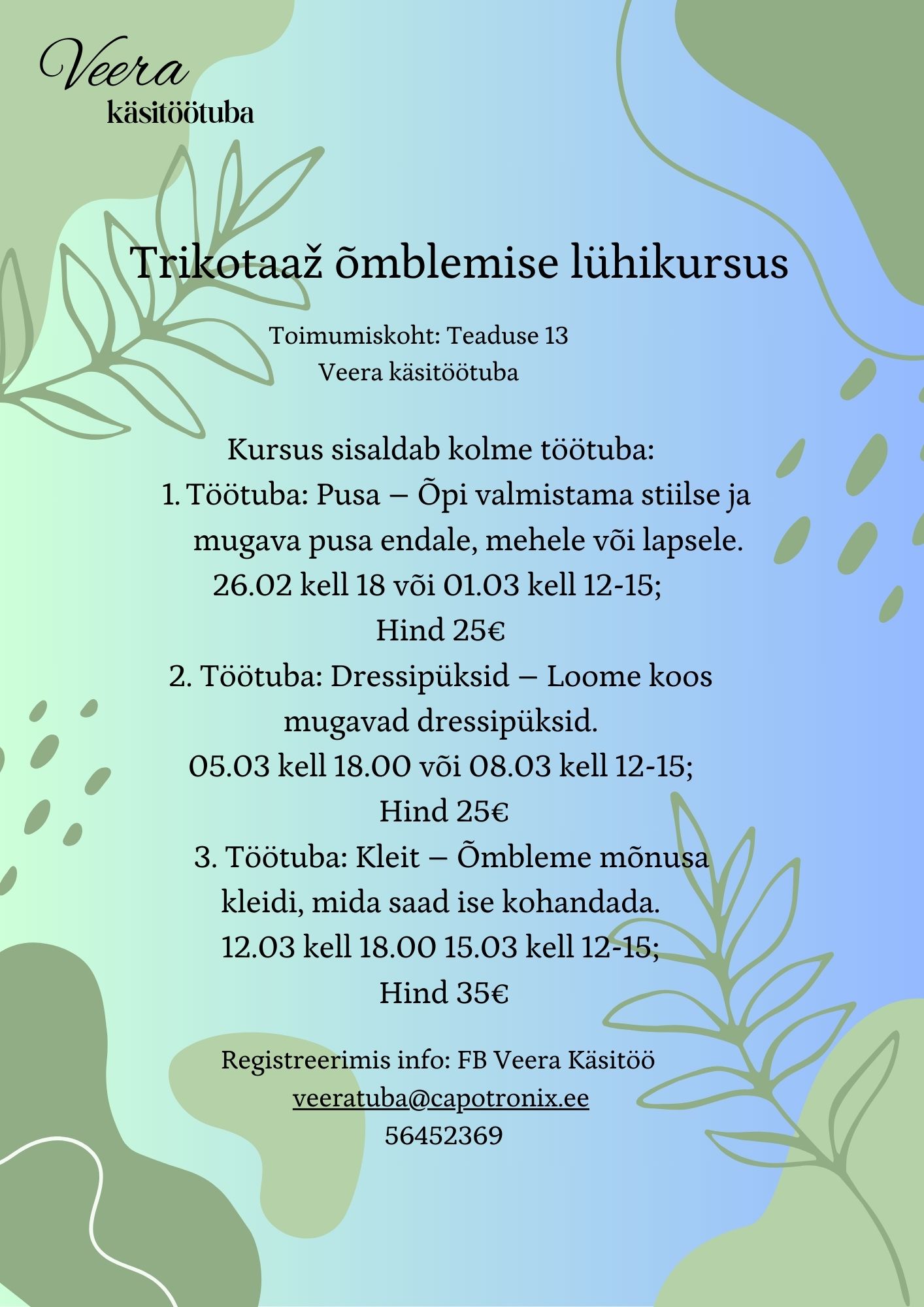 25€Kas tahad õppida trikotaaži õmblemist ja luua endale unikaalseid riideesemeid? Liitu meie trikotaaži õmblemise lühikursusega, kus saad praktilisi oskusi ning loome koos erinevaid mugavaid ja praktilisi rõivaid!