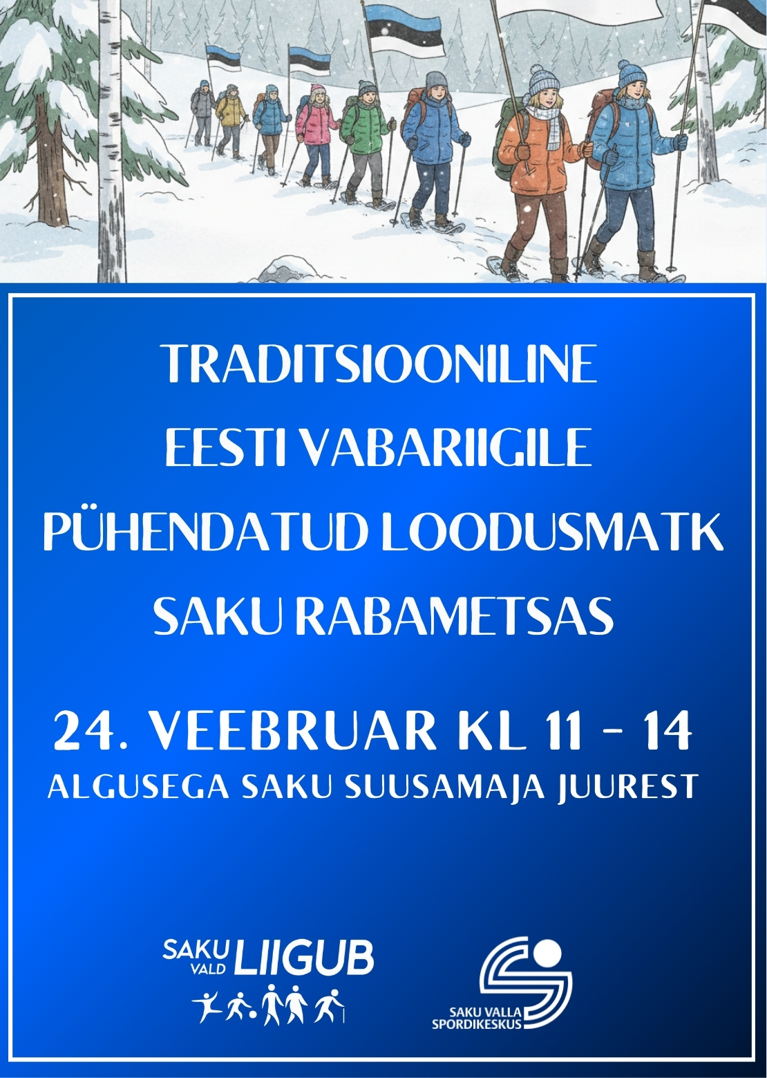 24.02.2026 kl 11.00 saame kokku Saku Suusamaja juures ja tähistame Eesti Vabariigi aastapäeva ühe toreda loodusmatkaga. Kohapeal saab tasuta sooja joogi ja soolase ampsu.