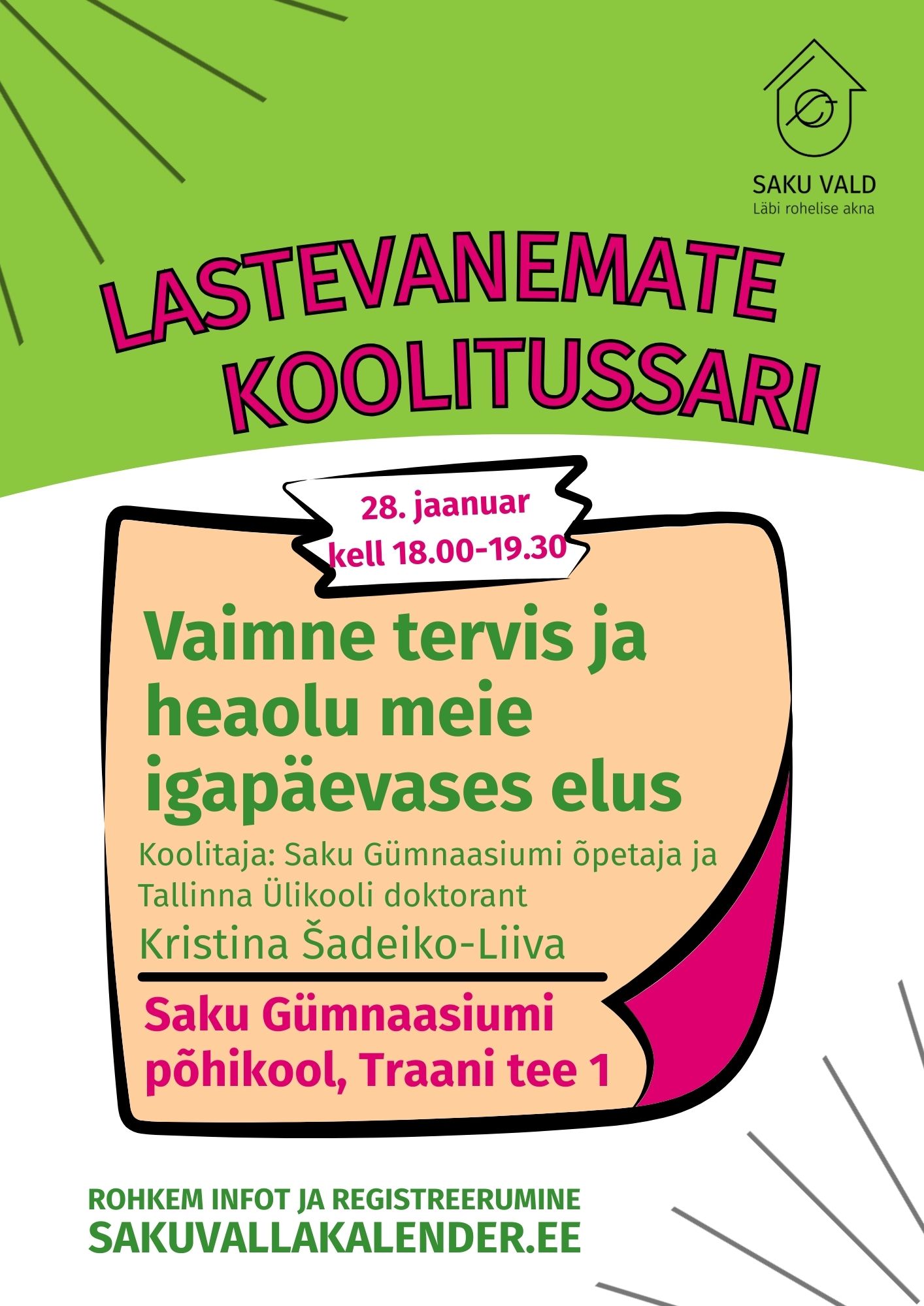 Ootame kõiki lapsevanemaid koolitusele, mis keskendub laste ja täiskasvanute vaimsele tervisele ning heaolule. Koolitus aitab mõista, millised tegurid toetavad või takistavad vaimset tasakaalu ja kuidas igapäevased valikud – sealhulgas eluviis, suhted, digikeskkond ja füüsiline ruum – mõjutavad meid kogu elukaare jooksul.