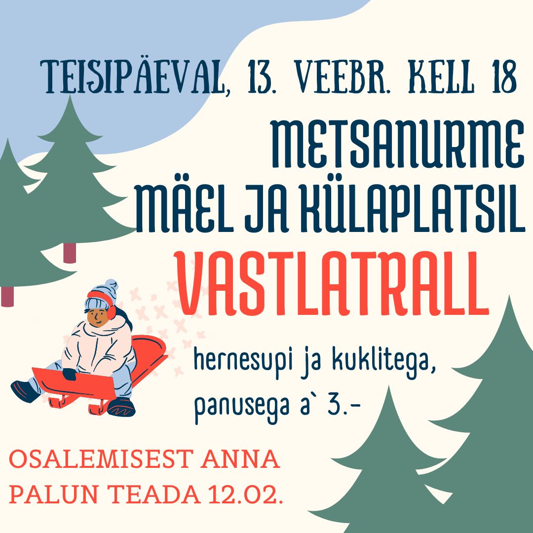 Lisaks pikima liu võistlusele sööme hernesuppi ja maiustame vastlakukliga. Palun anna oma osalemisest teada, et suppi ja kukleid piisav hulk saaks. Tee seda siitkaudu hiljemalt 12.02. https://forms.gle/aAdD3aYnKNJ5dvPcA